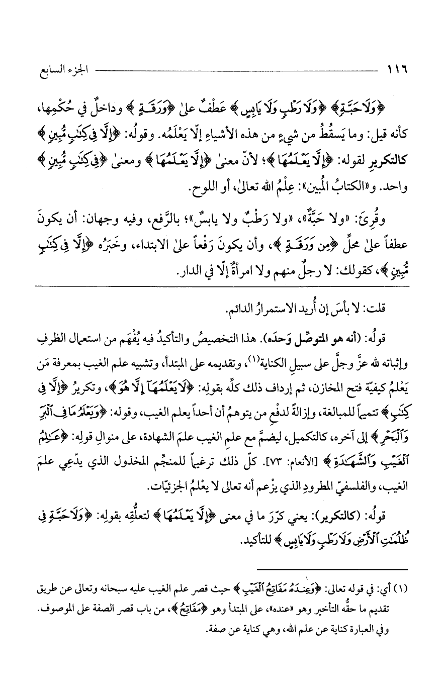 قوله: (كالتكرير): يعني كرر ما في معنى (إلاَّ يَعْلَمُهَا) لتعلقه بقوله: (ولا حَبَّةٍ فِي ظُلُمَاتِ الأَرْضِ ولا رَطْبٍ ولا يَابِسٍ) للتأكيد.