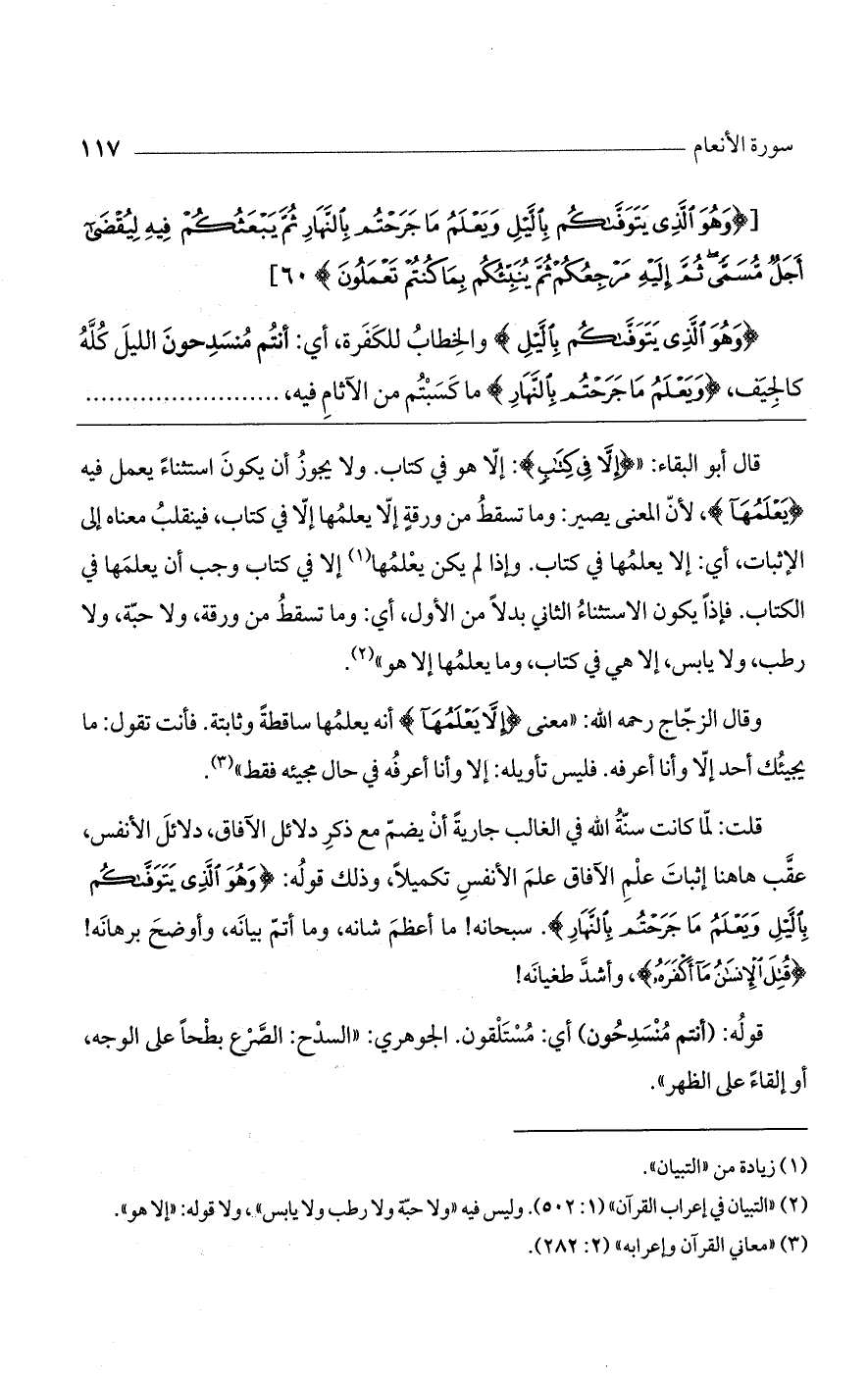 قلت: لما كانت سنة الله في الغالب جارية أن يضم مع ذكر دلائل الآفاق، دلائل الأنفس، عقب هاهنا إثبات علم الآفاق علم الأنفس تكميلاً، وذلك قوله: (وهُوَ الَّذِي يَتَوَفَّاكُم بِاللَّيْلِ ويَعْلَمُ مَا جَرَحْتُم بِالنَّهَارِ). سبحانه! ما أعظم شأنه، وما أتم بيانه، وأوضح برهانه! (قُتِلَ الإنسَانُ مَا أَكْفَرَهُ)، وأشد طغيانه!