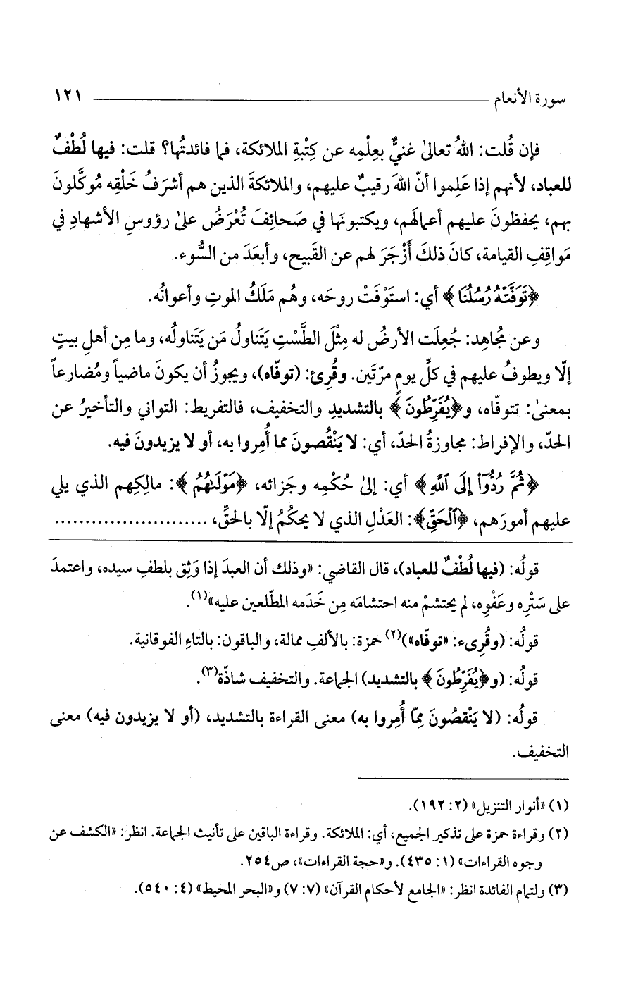 وعن مجاهد: جعلت الأرض له مثل الطست يتناول من يتناوله، وما من أهل بيتٍ إلا ويطوف عليهم في كل يوم مرّتين. وقرئ: (توفاه)، ويجوز أن يكون ماضياً ومضارعاً بمعنى: تتوفاه، و (يُفَرِّطُونَ) بالتشديد والتخفيف، فالتفريط: التواني والتأخير عن الحدّ، والإفراط: مجاوزة الحدّ، أي: لا ينقصون مما أمروا به، أو لا يزيدون فيه.