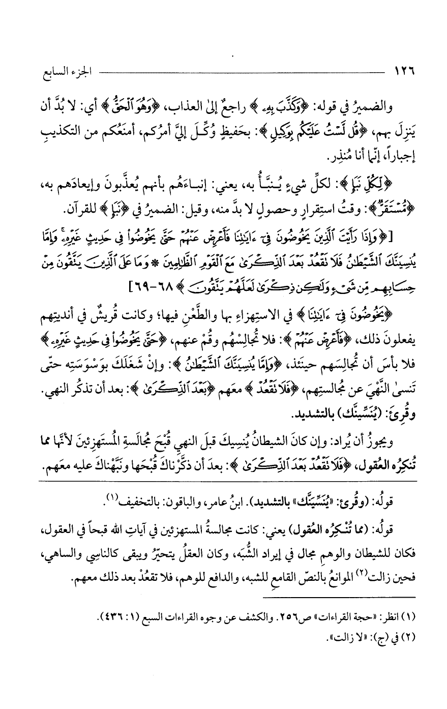 (يَخُوضُونَ فِي آياتِنا) في الاستهزاء بها والطعن فيها؛ وكانت قريشٌ في أنديتهم يفعلون ذلك، (فَأَعْرِضْ عَنْهُمْ): فلا تجالسهم وقم عنهم، (حَتَّى يَخُوضُوا فِي حَدِيثٍ غَيْرِهِ) فلا بأس أن تجالسهم حينئذ، (وَإِمَّا يُنْسِيَنَّكَ الشَّيْطانُ): وإن شغلك بوسوسته حتى تنسى النهي عن مجالستهم، (فَلا تَقْعُدْ) معهم (بَعْدَ الذِّكْرى): بعد أن تذكر النهي. وقرئ: (ينسينك) بالتشديد.