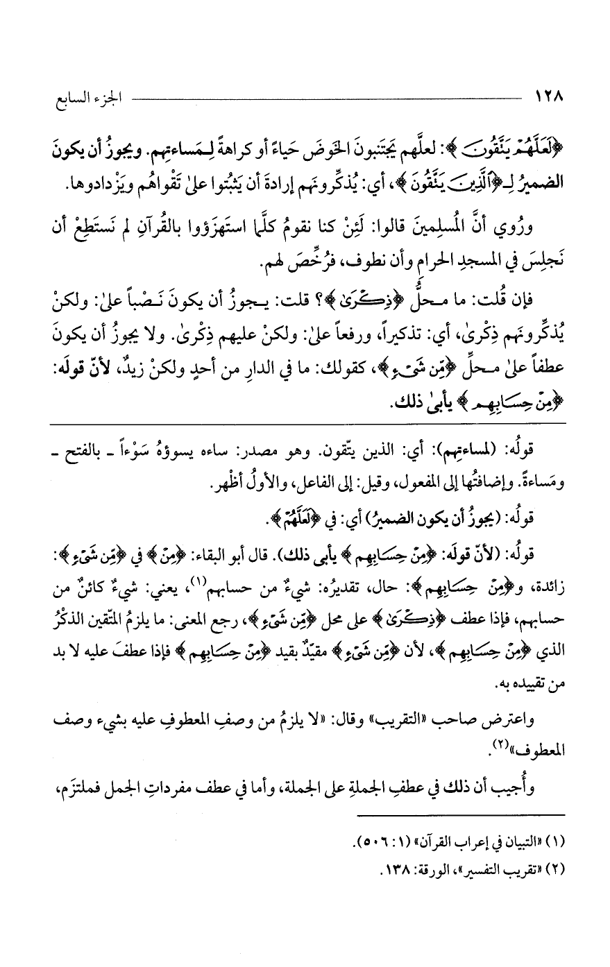 قوله: (لأن قوله: (مِنْ حِسَابِهِم) يأبي ذلك). قال أبو البقاء: (مِنْ) في (مِنْ شَيءٍ): زائدة، و (مِنْ حِسَابِهِم): حال، تقديره: شيء من حسابهم، يعني: شيء كائن من حسابهم، فإذا عطف (ذِكْرَى) على محل (مِنْ شَيءٍ)، رجع المعنى: ما يلزم المتقين الذكر الذي (مِنْ حِسَابِهِم)، لأن (مِنْ شَيءٍ) مقيد بقيد (مِنْ حِسَابِهِم) فإذا عطف عليه لابد من تقييده به.