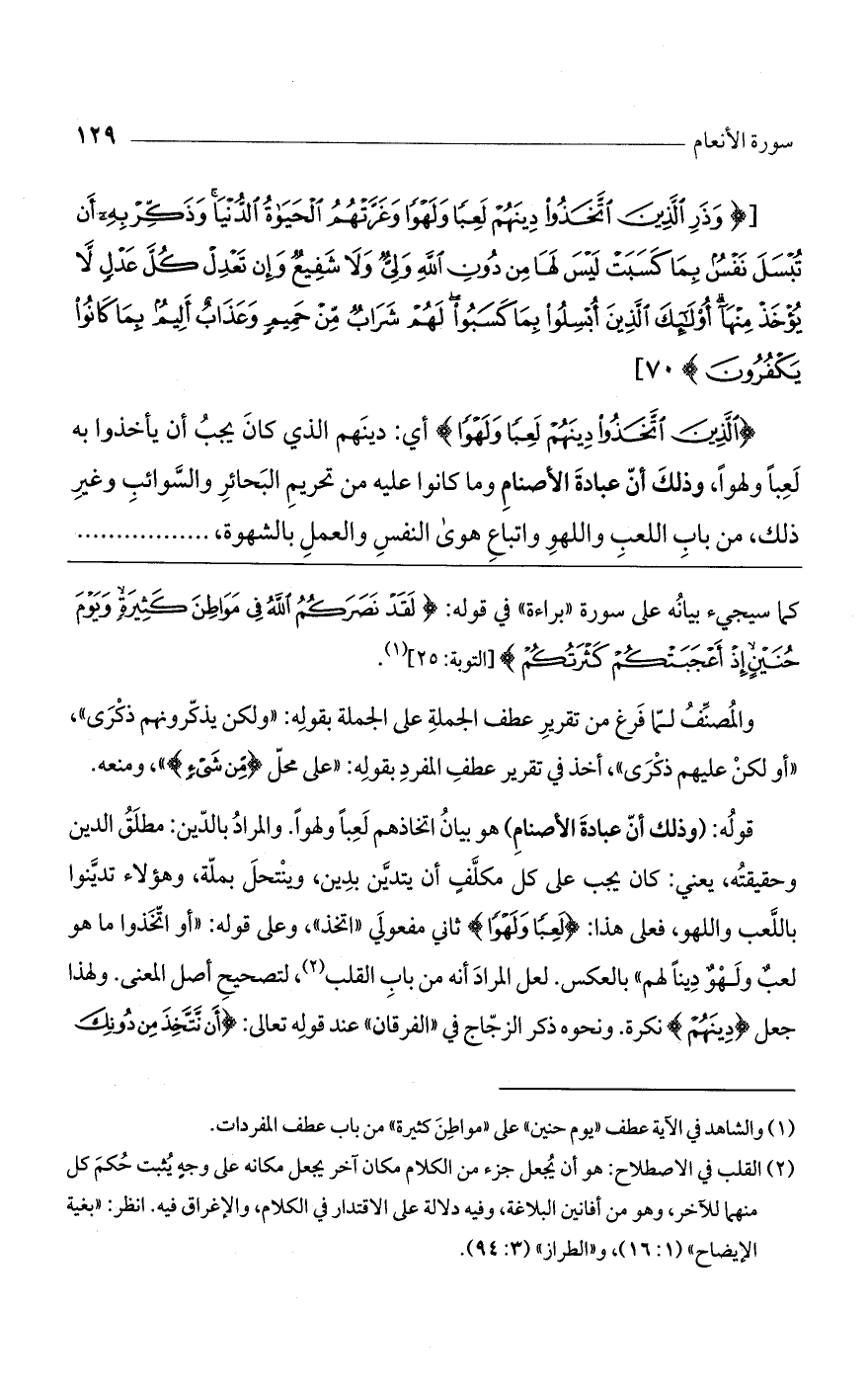 (الَّذِينَ اتَّخَذُوا دِينَهُمْ لَعِباً وَلَهْواً) أي: دينهم الذي كان يجب أن يأخذوا به لعباً ولهواً، وذلك أن عبادة الأصنام وما كانوا عليه من تحريم البحائر والسوائب وغير ذلك، من باب اللعب واللهو واتباع هوى النفس والعمل بالشهوة، .....