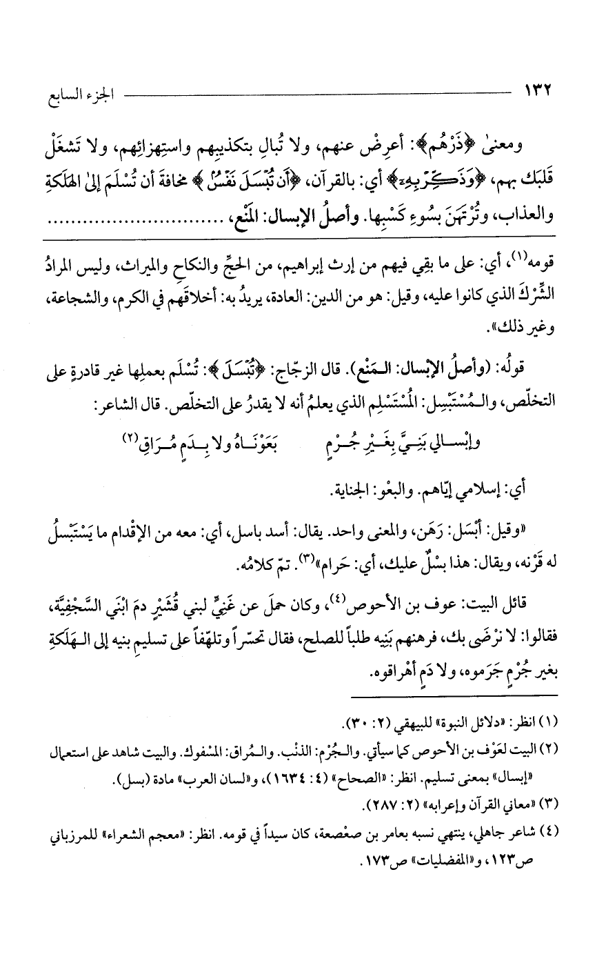 ومعنى (ذرهم): أعرض عنهم، ولا تبال بتكذيبهم واستهزائهم ولا تشغل قلبك بهم (وَذَكِّرْ بِهِ) أي: بالقرآن، (أَنْ تُبْسَلَ نَفْسٌ) مخافة أن تسلم إلى الهلكة والعذاب، وترتهن بسوء كسها. وأصل الإبسال: المنع، .....