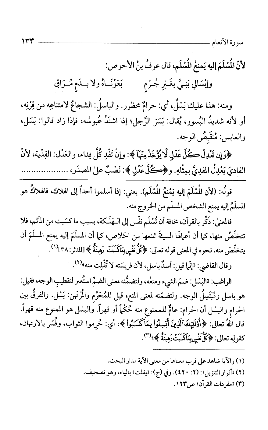 الراغب: "البسل: ضم الشيء ومنعه، ولتضمنه لمعنى الضم استعير لتقطيب الوجه، فقيل: هو باسل ومبتسل الوجه. ولتضمنه لمعنى المنع، قيل للمحرم والمرتهن: بسل. والفرق بين الحرام والبسل أن الحرام: عام للممنوع منه حكماً أو قهراً. والبسل هو الممنوع منه قهراً. قال الله تعالى: أُوْلَئِكَ الَّذِينَ أُبْسِلُوا بِمَا كَسَبُوا، أي: حرموا الثواب، وفسر بالارتهان، كقوله تعالى: (كُلُّ نَفْسٍ بِمَا كَسَبَتْ رَهِينَةٌ) ".