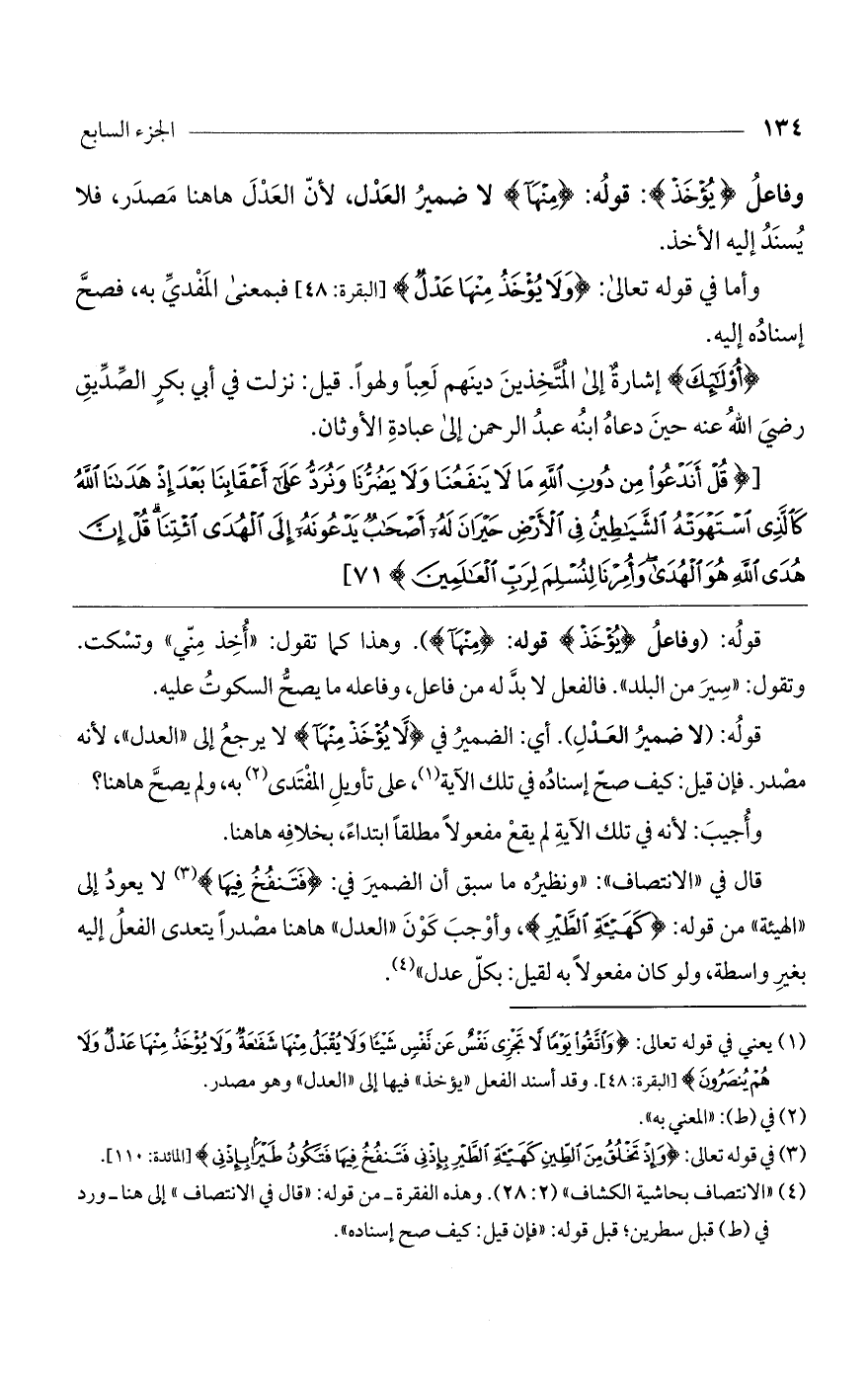 قوله: (لا ضمير العدل). أي: الضمير في (لا يُؤْخَذُ مِنْهَا) لا يرجع إلى "العدل"، لأنه مصدر. فإن قيل: كيف صح إسناده في تلك الآية، على تأويل المفتدى به، ولم يصح هاهنا؟