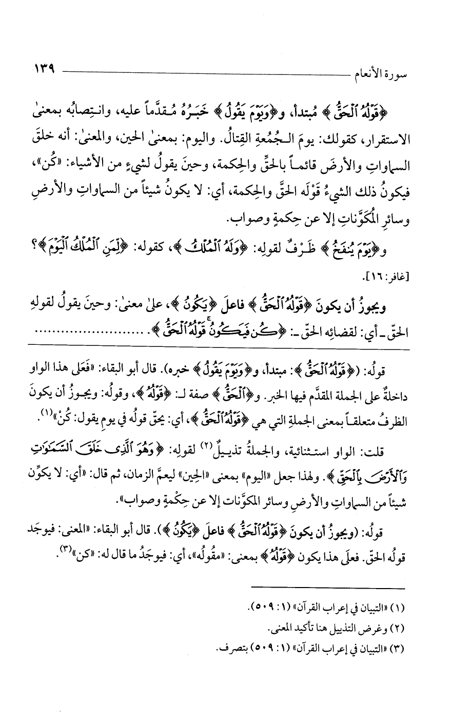 ويجوز أن يكون (قَوْلُهُ الْحَقُّ) فاعل (يكون)، على معنى: وحين يقول لقوله الحق- أي: لقضائه الحق-: (كُنْ فيكون قوله الحق) .........
