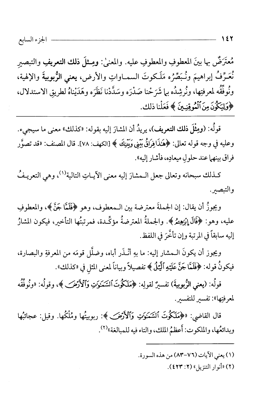 معترضٌ بها بين المعطوف والمعطوف عليه. والمعنى: ومثل ذلك التعريف والتبصير نعرف إبراهيم ونبصره ملكوت السموات والأرض، يعني الربوبية والإلهية، ونوفقه لمعرفتها، ونرشده بما شرحا صدره وسدّدنا نظره وهديناه لطريق الاستدلال، (وَلِيَكُونَ مِنَ اَلْمُوقِنِينَ) فعلنا ذلك.