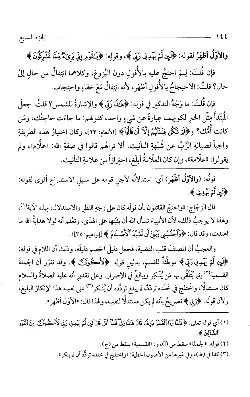 فإن قلت: ما وجه التذكير في قوله: (هذا رَبِّي) والإشارة للشمس؟ قلت: جعل المبتدأ مثل الخبر لكونهما عبارةً عن شيءٍ واحد، كقولهم: ما جاءت حاجتك، ومن كانت أمك؟ و (لَمْ تَكُنْ فِتْنَتُهُمْ إِلَّا أَنْ قالُوا) [الأنعام: 23]، وكان اختيار هذه الطريقة واجباً لصيانة الرب عن شبهة التأنيث. ألا تراهم قالوا في صفة الله: «علام»، ولم يقولوا: «علامة» وإن كان العلامة أبلغ، احترازاً من علامة التأنيث.