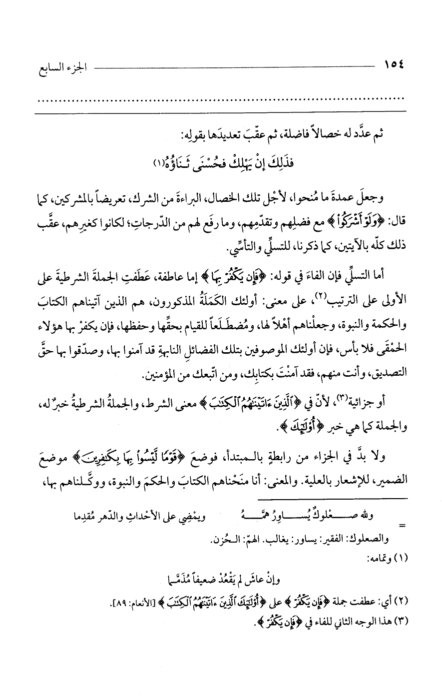 أما التسلي فإن الفاء في قوله: (فَإن يَكْفُرْ بِهَا) إما عاطفة، عطفت الجملة الشرطية على الأولى على الترتيب، على معنى: أولئك الكملة المذكورون، هم الذين آتيناهم الكتاب والحكمة والنبوة، وجعلناهم أهلاً لها، ومضطلعاً للقيام بحقها وحفظها، فإن يكفر بها هؤلاء الحمقى فلا بأس، فإن أولئك الموصوفين بتلك الفضائل النابهة قد آمنوا بها، وصدقوا بها حق التصديق، وأنت منهم، فقد آمنت بكتابك، ومن اتبعك من المؤمنين.