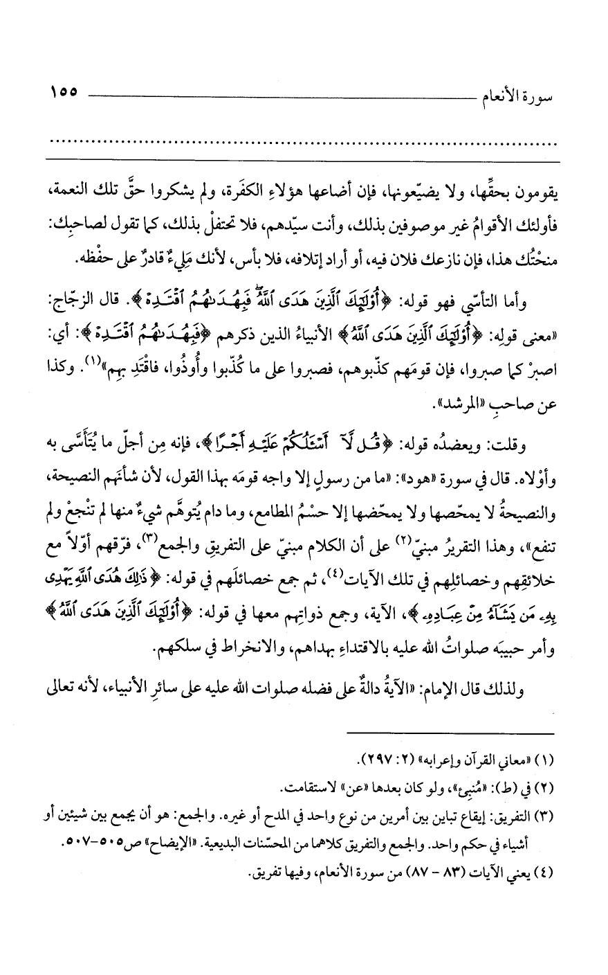 وقلت: ويعضده قوله: (قُل لاَّ أَسْأَلُكُمْ عَلَيْهِ أَجْرًا)، فإنه من أجل ما يتأسى به وأولاه. قال في سورة "هود": "ما من رسول إلا واجه قومه بهذا القول، لأن شأنهم النصيحة، والنصيحة لا يمحصها ولا يمحضها إلا حسم المطامع، وما دام يتوهم شيء منها لم تنجع ولم تنفع"، وهذا التقرير مبني على أن الكلام مبني على التفريق والجمع، فرقهم أولاً مع خلائقهم وخصائلهم في تلك الآيات، ثم جمع خصائلهم في قوله: (ذَلِكَ هُدَى اللَّهِ يَهْدِي بِهِ مَن يَشَاءُ مِنْ عِبَادِهِ)، الآية، وجمع ذواتهم معها في قوله: (أُوْلَئِكَ الَّذِينَ هَدَى اللَّهُ) وأمر حبيبه صلوات الله عليه بالاقتداء بهداهم، والانخراط في سلكهم.
