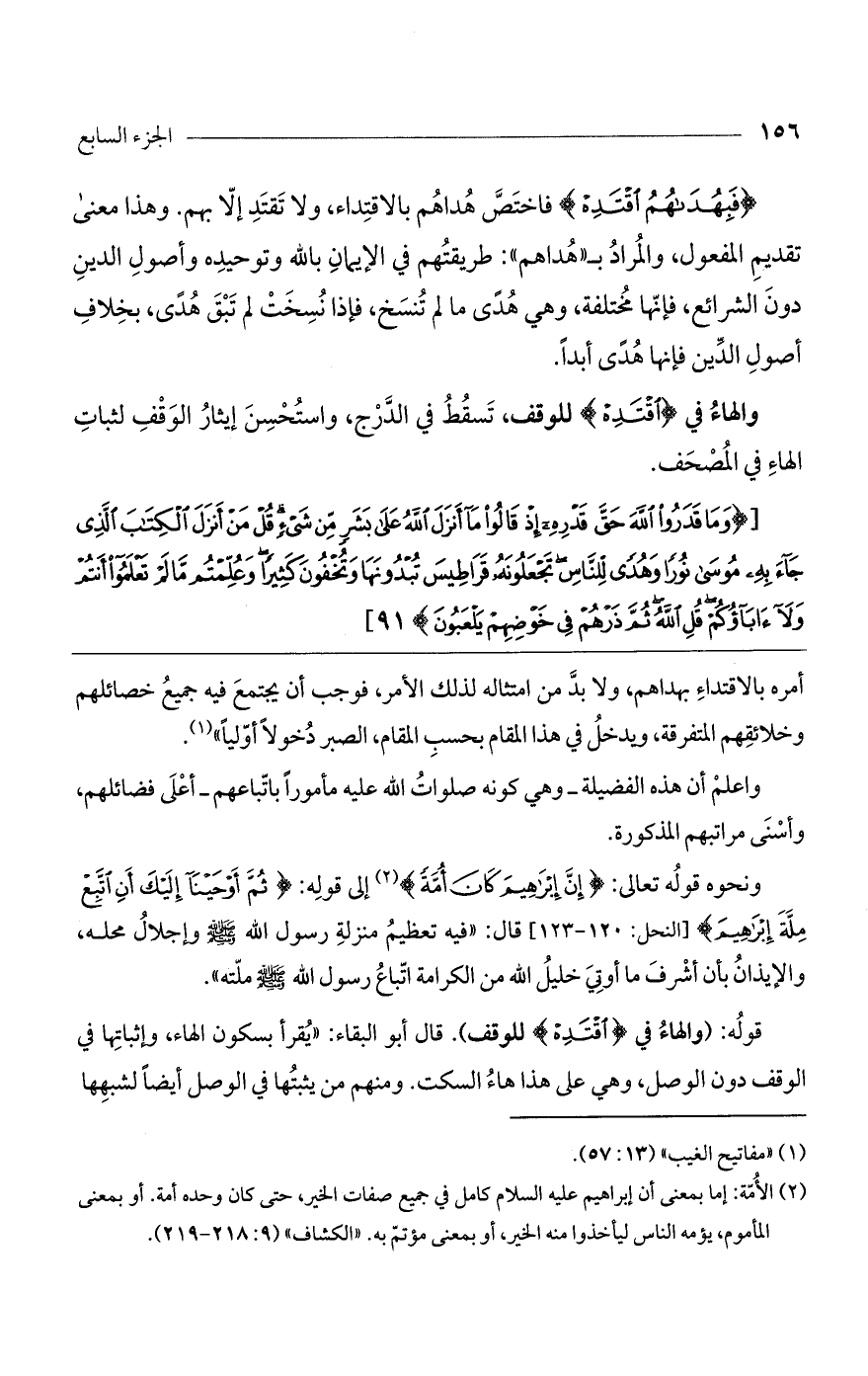 (فَبِهُداهُمُ اقْتَدِهْ) فاختص هداهم بالاقتداء، ولا تقتد إلا بهم. وهذا معنى تقديم المفعول، والمراد بـ"هداهم": طريقتهم في الإيمان بالله وتوحيده وأصول الدين دون الشرائع، فإنها مختلفة، وهي هدى ما لم تنسخ، فإذا نسخت لم تبق هدىً، بخلاف أصول الدين فإنها هدى أبداً.