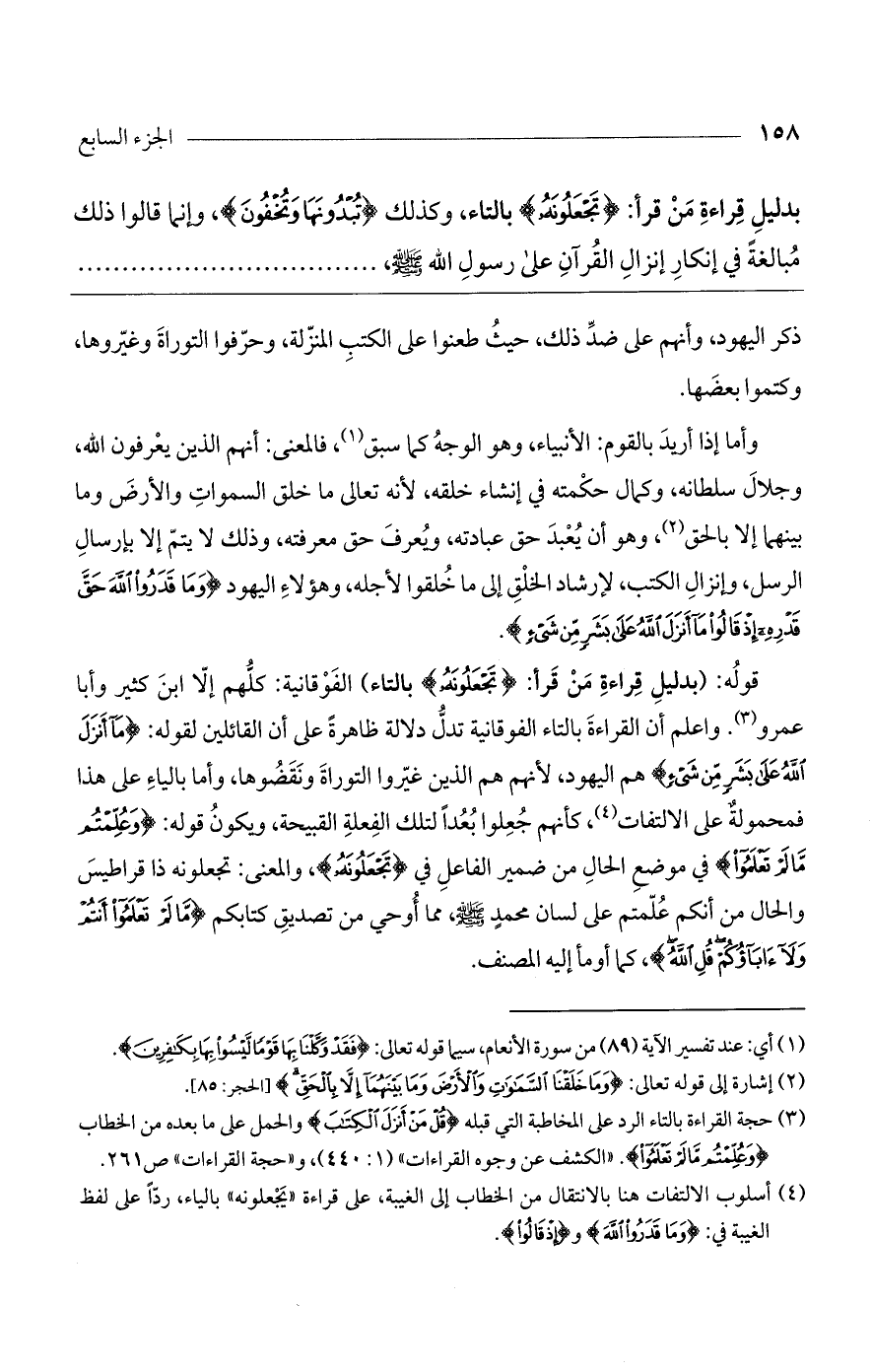 قوله: (بدليل قراءة من قرأ: (تَجْعَلُونَهُ) بالتاء) الفوقانية: كلهم إلا ابن كثير وأبا عمرو. واعلم أن القراءة بالتاء الفوقانية تدل دلالة ظاهرةً على أن القائلين لقوله: (مَا أَنزَلَ اللَّهُ عَلَى بَشَرٍ مِّن شَيْءٍ) هم اليهود، لأنهم هم الذين غيروا التوراة ونقضوها، وأما بالياء على هذا فمحمولة على الالتفات، كأنهم جعلوا بعداً لتلك الفعلة القبيحة، ويكون قوله: (وعُلِّمْتُم مَّا لَمْ تَعْلَمُوا) في موضع الحال في ضمير الفاعل في (تَجْعَلُونَهُ)، والمعنى: تجعلونه ذا قراطيس والحال من أنكم علمتم على لسان محمد صلي الله عليه وسلم، مما أوحي من تصديق كتابكم (مَّا لَمْ تَعْلَمُوا أَنتُمْ ولا آبَاؤُكُمْ قُلِ اللَّهُ)، كما أومأ إليه المصنف.
