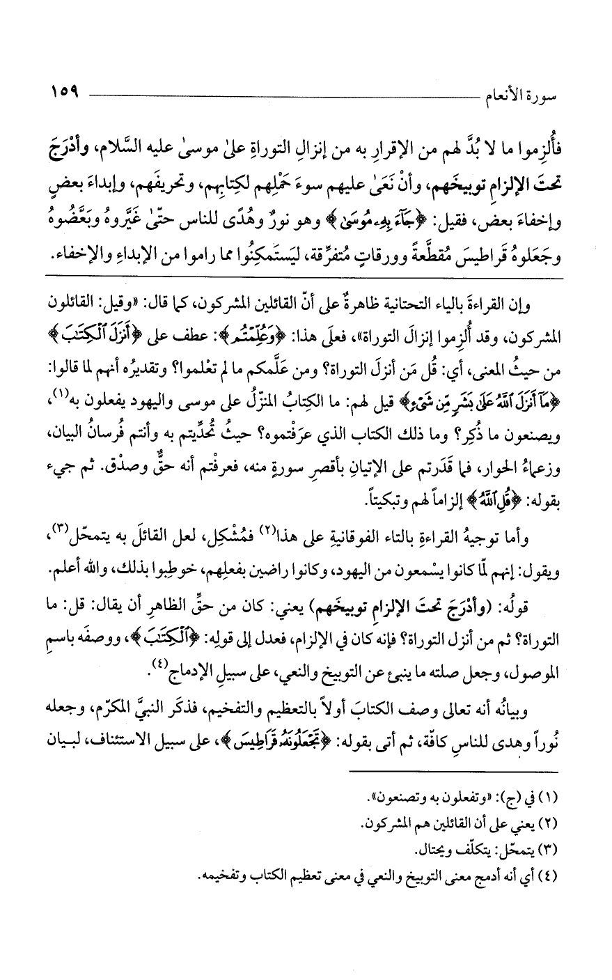 فألزموا ما لا بدّ لهم من الإقرار به من إنزال التوراة على موسى عليه السلام، وأدرج تحت الإلزام توبيخهم وأن نعى عليهم سوء حملهم لكتابهم، وتحريفهم، وإبداء بعضٍ وإخفاء بعض، فقيل: (جاءَ بِهِ مُوسى) وهو نورٌ وهدى للناس حتى غيروه ونقصوه وجعلوه قراطيس مقطعةً وورقاتٍ مفرقة، ليتمكنوا مما راموا من الإبداء والإخفاء.