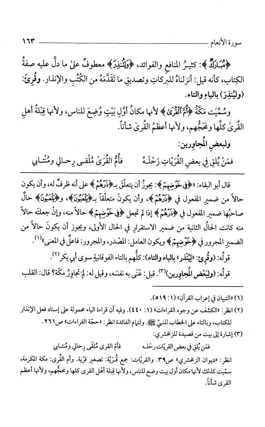 (مُبارَكٌ): كثير المنافع والفوائد، (ولتنذر) معطوفٌ على ما دلّ عليه صفة الكتاب، كأنه قيل: أنزلناه للبركات وتصديق ما تقدمه من الكتب والإنذار. وقرئ: (ولينذر) بالياء والتاء.