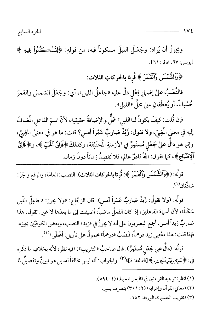 قوله: ((والشَّمْسَ والْقَمَرَ): قرئا بالحركات الثلاث). النصب: العامة، والرفع والجر: شاذتان.