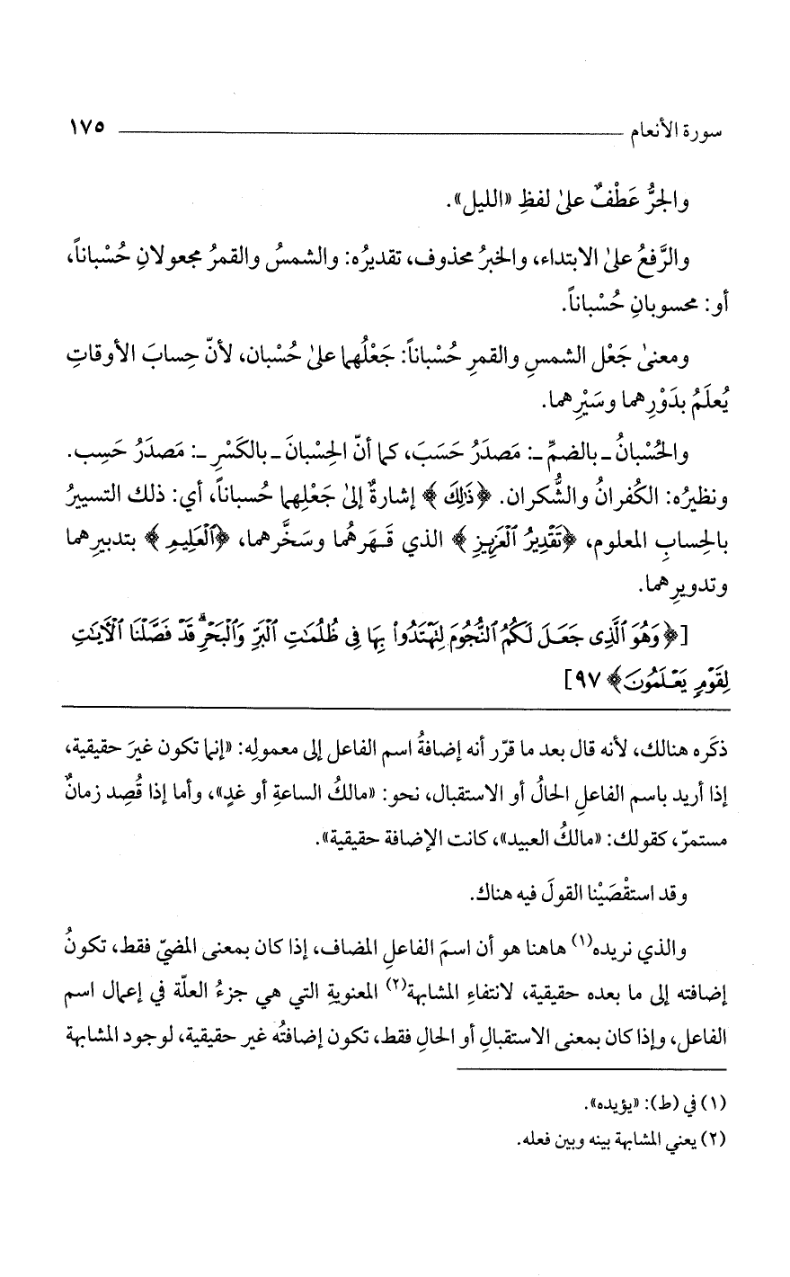 ومعنى جعل الشمس والقمر حسباناً: جعلهما على حسبان، لأنّ حساب الأوقات يعلم بدورهما وسيرهما.