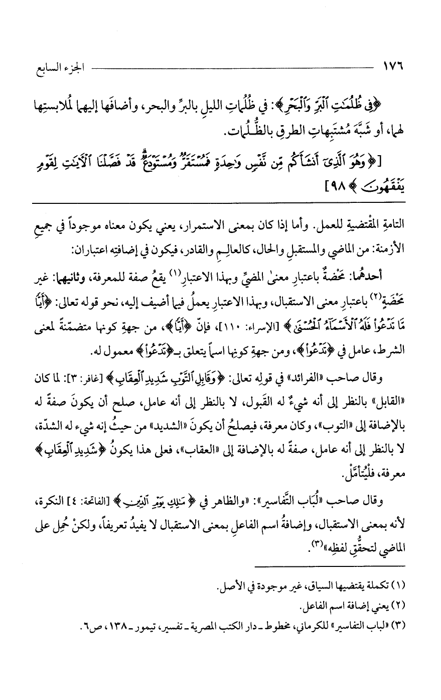 وقال صاحب "الفرائد" في قوله تعالى: (وقَابِلِ التَّوْبِ شَدِيدِ العِقَابِ) [غافر: 3]: لما كان "القابل" بالنظر إلى أنه شيء له القبول، لا بالنظر إلى أنه عامل، صلح أن يكون صفةً له بالإضافة إلى "التوب"، وكان معرفة، فيصلح أن يكون "الشديد" من حيث إنه شيء له الشدة، لا بالنظر إلى أنه عامل، صفةً له بالإضافة إلى "العقاب"، فعلى هذا يكون (شَدِيدُ العِقَابِ) معرفة، فليتأمل.