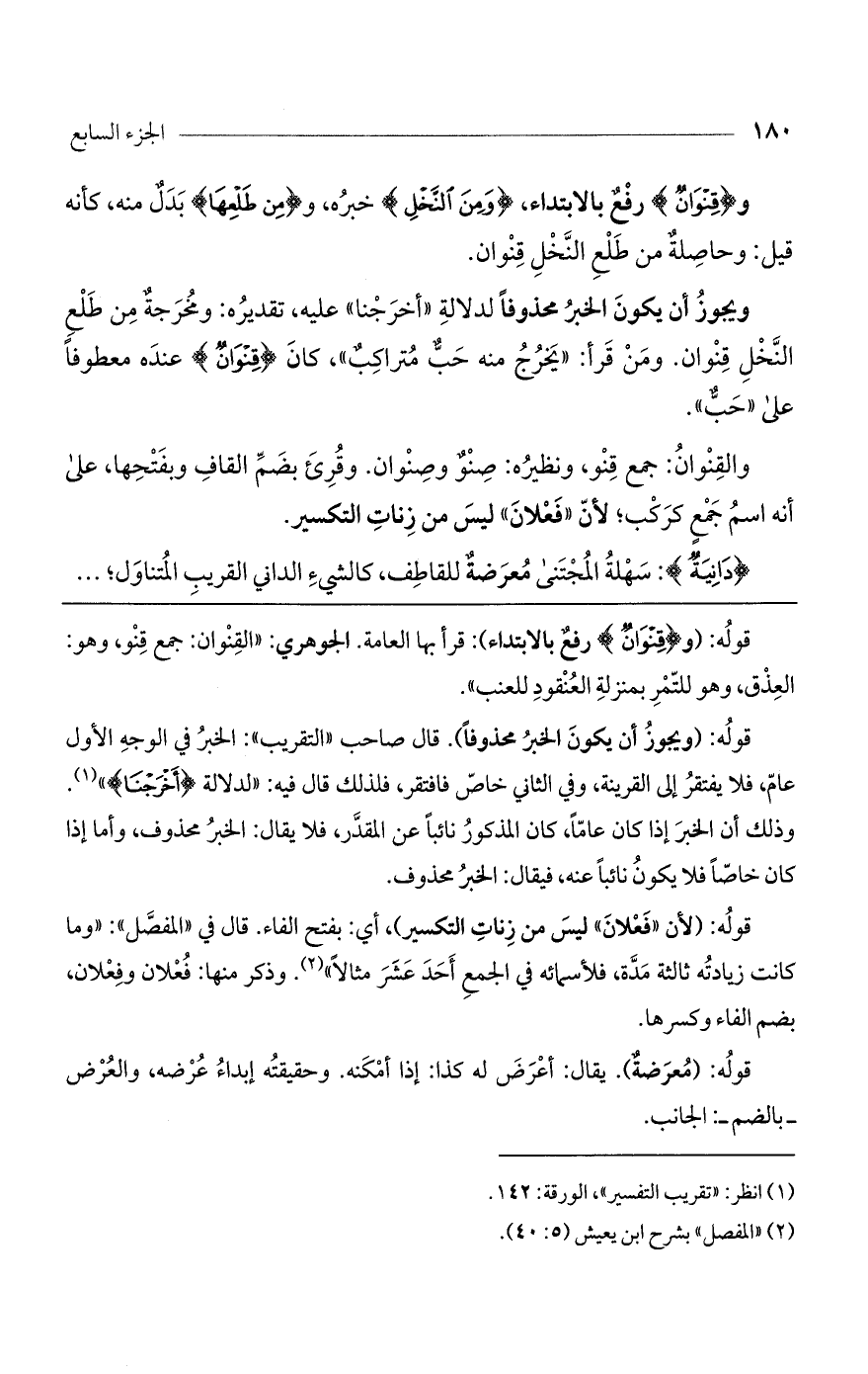 قوله: (و (قِنْوَانٌ) رفع بالابتداء): قرأ بها العامة. الجوهري: "القنوان: جمع قنو، وهو: العذق، وهو للتمر بمنزلة العنقود للعنب".