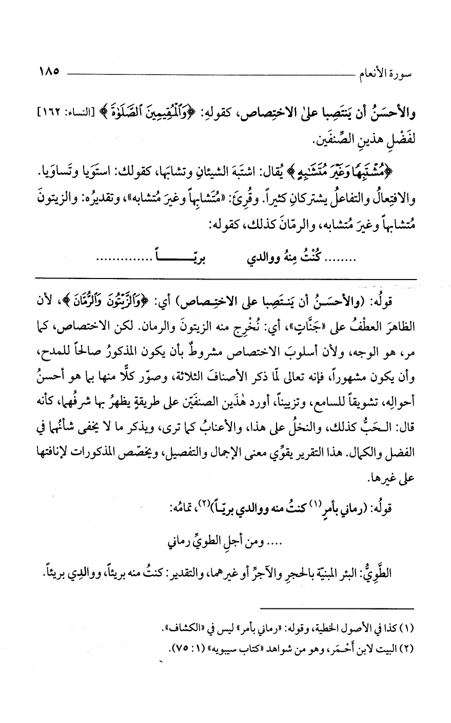 قوله: (والأحسن أن ينتصبا على الاختصاص) أي: (والزَّيْتُونَ والرُّمَّانَ)، لأن الظاهر العطف على "جناتٍ"، أي: نخرج منه الزيتون والرمان. لكن الاختصاص، كما مر، هو الوجه، ولأن أسلوب الاختصاص مشروط بأن يكون المذكور صالحاً للمدح، وأن يكون مشهوراً، فإنه تعالى لما ذكر الأصناف الثلاثة، وصور كلا منها بما هو أحسن أحواله، تشويقاً للسامع، وتزييناً، أورد هذين الصنفين على طريقةٍ يظهر بها شر فهما، كأنه قال: الحب كذلك، والنخل على هذا، والأعناب كما ترى، ويذكر ما لا يخفى شأنهما في الفضل والكمال. هذا التقرير يقوي معنى الإجمال والتفصيل، ويخصص المذكورات لإنافتها على غيرها.