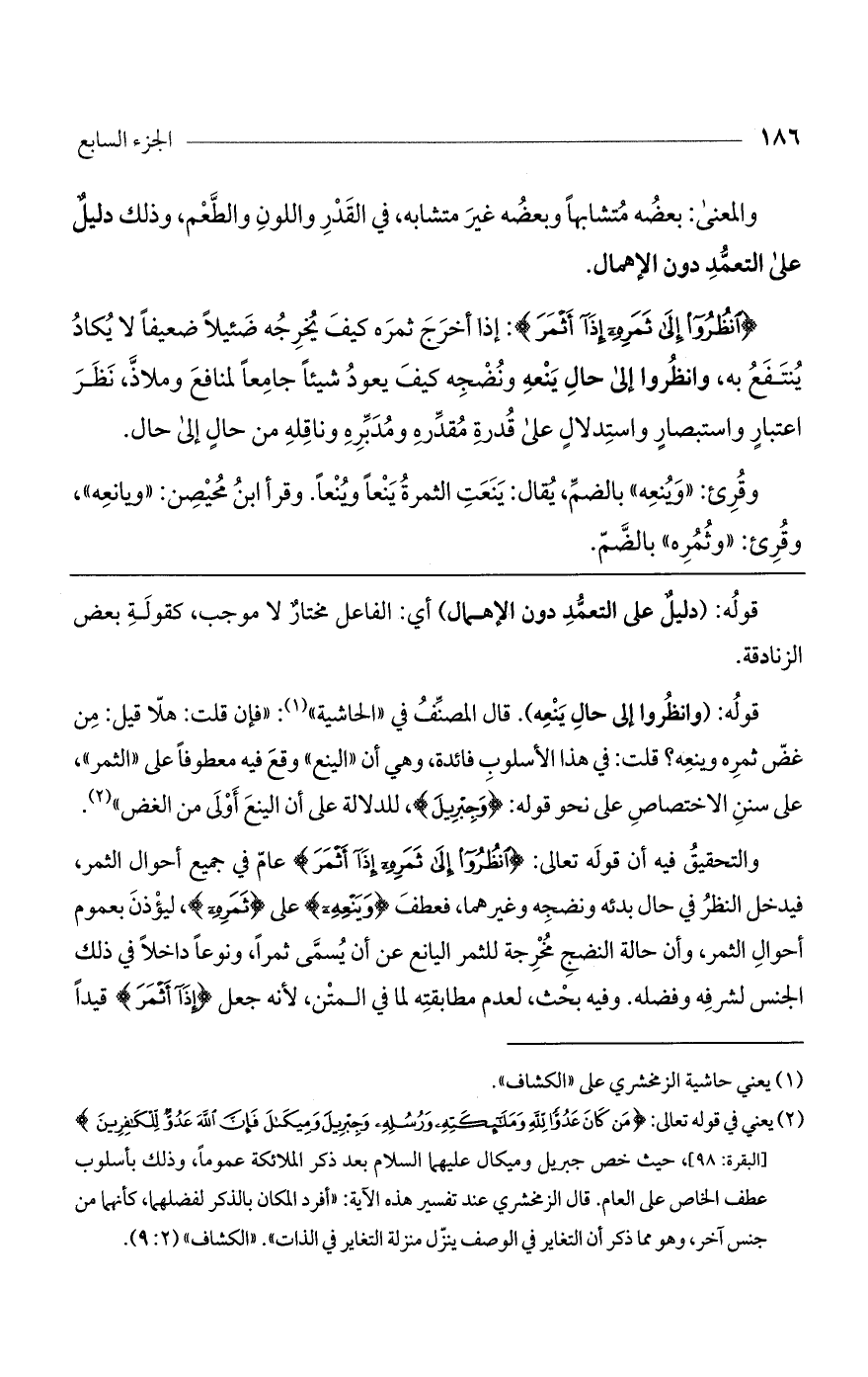 قوله: (وانظروا إلى حال ينعه). قال المصنف في "الحاشية": "فإن قلت: هلا قيل: من غض ثمره وينعه؟ قلت: في هذا الأسلوب فائدة، وهي أن "الينع" وقع فيه معطوفاً على "الثمر"، على سنن الاختصاص على نحو قوله: (وَجِبْرِيِلَ)، للدلالة على أن الينع أولى من الغض".