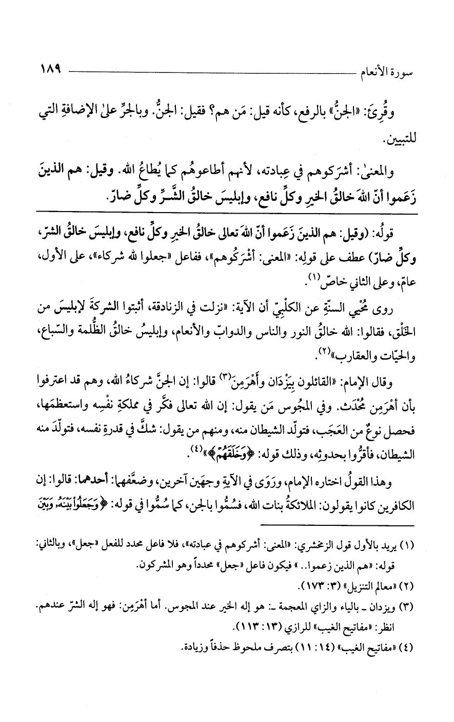وقال الإمام: "القائلون بيزدان وأهرمن قالوا: إن الجن شركاء الله، وهم قد اعترفوا بأن أهرمن محدث. وفي المجوس من يقول: إن الله تعالى فكر في مملكة نفسه واستعظمها، فحصل نوع من العجب، فتولد الشيطان منه، ومنهم من يقول: شك في قدرة نفسه، فتولد منه الشيطان، فأقروا بحدوثه، وذلك قوله: (وَخَلَقَهُمْ) ".