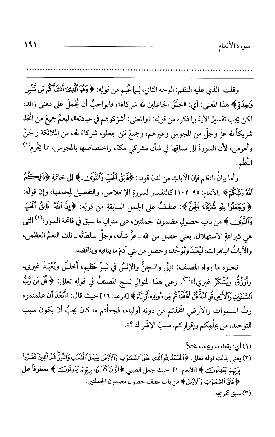 وأما بيان النظم فإن الآيات من لدن قوله: (فَالِقُ الحَبِّ والنَّوَى) إلى خاتمة (ذلكم الله ربكم) [الأنعام: 95 - 102] كالتفسير لسورة الإخلاص، والتفصيل لمجملها، وإن قوله: (وجَعَلُوا لِلَّهِ شُرَكَاءَ الجِنَّ): عطف على الجمل السابقة من قوله: (إنَّ اللَّهَ فَالِقُ الحَبِّ والنَّوَى) من باب حصول مضمون الجملتين، على منوال ما سبق في فاتحة السورة التي هي كبراعة الاستهلال. يعني حصل من الله - عز شأنه، وجل سلطانه - تلك النعم العظمى، والآيات الباهرات، ليعبد ويوحد، وحصل من بني آدم ما ينافيه ويناقضه.