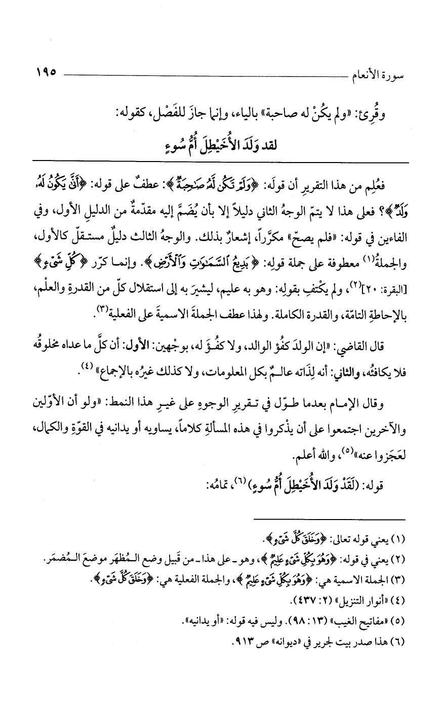 فعلم من هذا التقرير أن قوله: (ولَمْ تَكُن لَّهُ صَاحِبَةٌ): عطف على قوله: (أَنَّى يَكُونُ لَهُ ولَدٌ)؟ فعلى هذا لا يتم الوجه الثاني دليلاً إلا بأن يضم إليه مقدمة من الدليل الأول، وفي الفاءين في قوله: "فلم يصح" مكرراً، إشعار بذلك. والوجه الثالث دليل مستقل كالأول، والجملة معطوفة على جملة قوله: (بَدِيعُ السَّمَوَاتِ والأرْضِ). وإنما كرر (كُلِّ شَيْءٍ) [البقرة: 20]، ولم يكتف بقوله: وهو به عليم، ليشير به إلى استقلال كل من القدرة والعلم، بالإحاطة التامة، والقدرة الكاملة. ولهذا عطف الجملة الاسمية على الفعلية.