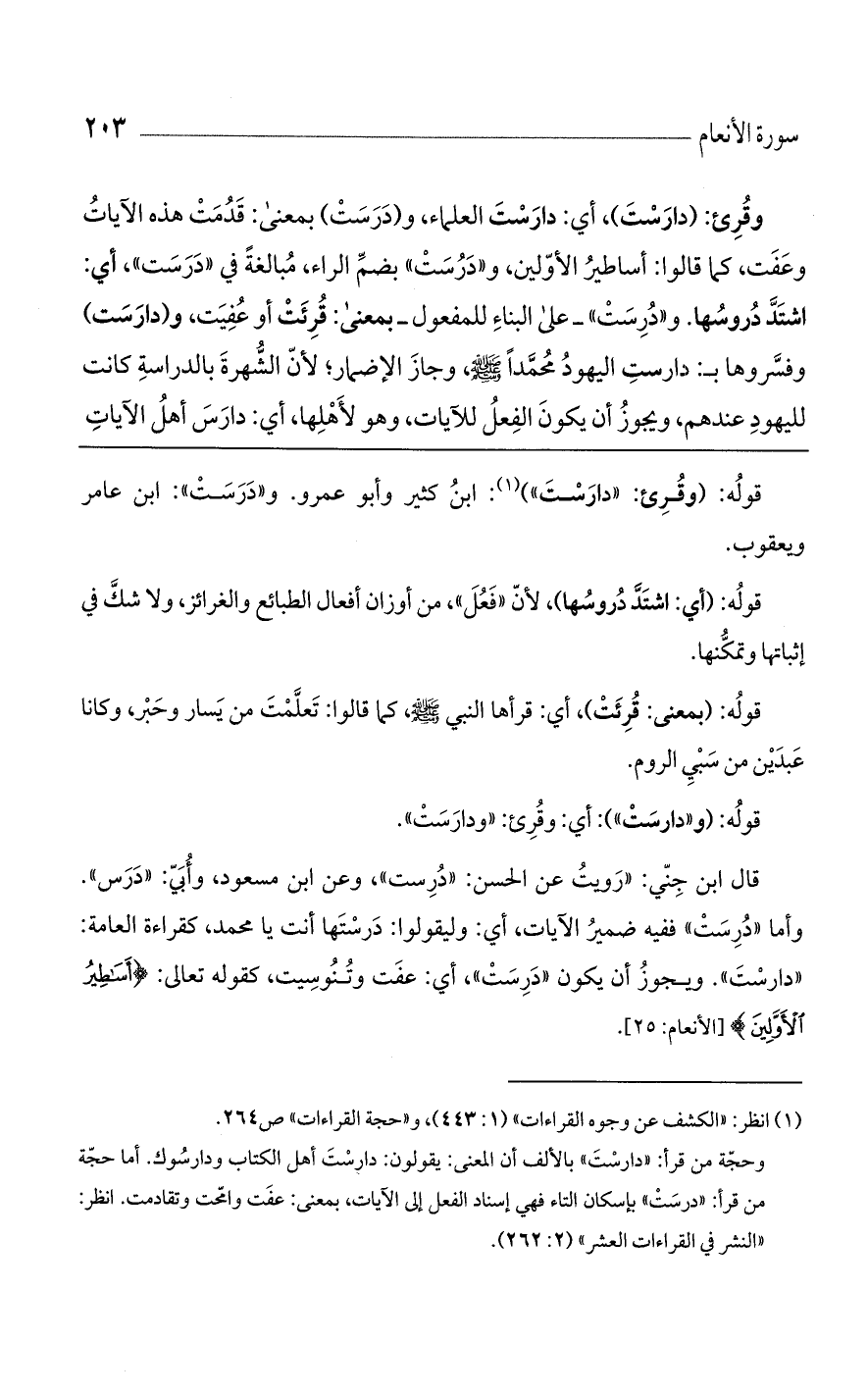 وقرئ: (دارست)، أي: دارست العلماء، و (درست) بمعنى: قدّمت هذه الآيات وعفت، كما قالوا: أساطير الأولين، و"درست" بضم الراء، مبالغة في "درست"، أي: اشتدّ دروسها. و"درست" - على البناء للمفعول - بمعنى: قرئت أو عفيت، و (دارست) وفسروها بـ: دارست اليهود محمداً صلى الله عليه وسلم، وجاز الإضمار، لأن الشهرة بالدراسة كانت لليهود عندهم، ويجوز أن يكون الفعل للآيات، وهو لأهلها، أي: دارس أهل الآيات