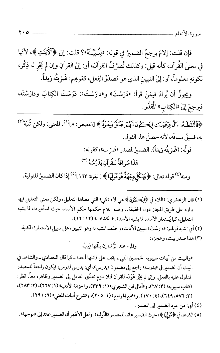 فإن قلت: إلام يرجع الضمير في قوله: "لِنُبَيِّنَهُ"؟ قلت: إلى (الآيات)، لأنها في معنى القرآن، كأنه قيل: وكذلك نُصرف القرآن، أو: إلى القرآن وإن لم يجر له ذكر، لكونه معلوماً، أو: إلى التبيين الذي هو مصدر الفعل، كقولهم: ضربته زيداً.
