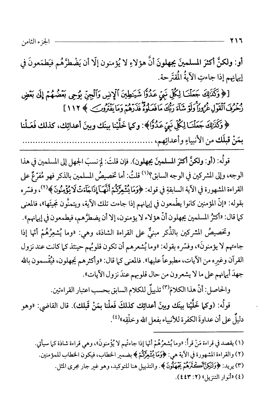 قوله: (أو: ولكن أكثر المسلمين يجهلون). فإن قلت: لم نسب الجهل إلى المسلمين في هذا الوجه، وإلى المشركين في الوجه السابق؟ قلت: أما تخصيص المسلمين بالذكر فهو مفرع على القراءة المشهورة في الآية السابقة في قوله: (ومَا يُشْعِرُكُمْ أَنَّهَا إذَا جَاءَتْ لا يُؤْمِنُونَ)، وفسره بقوله: "إن المؤمنين كانوا يطمعون في إيمانهم إذا جاءت تلك الآية، ويتمنون مجيئها"، فالمعنى كما قال: "أكثر المسلمين يجهلون أن هؤلاء لا يؤمنون، إلا أن يضطرهم، فيطعمون في إيمانهم".