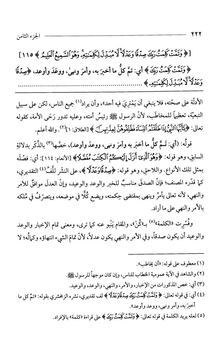 وفسرت "الكلمة" بـ"كن"، والمقام ينبو عنه كما ترى، ومعنى تمام الإخبار والوعد والوعيد أن يكون صدقاً، وفي الأمر والنهي يكون عدلاً، لأن تمام الشيء انتهاؤه وكماله؛ لا