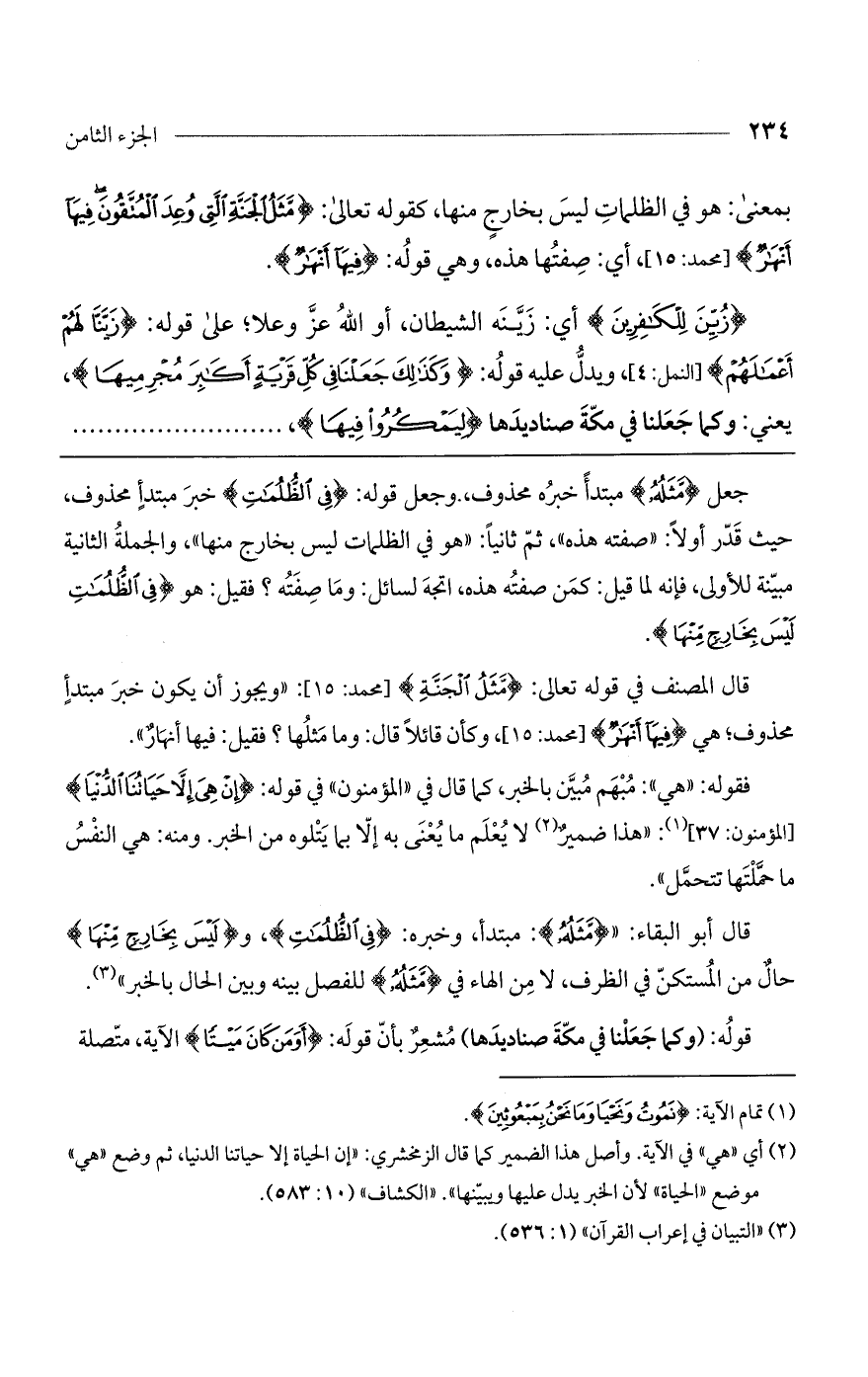 قال المصنف في قوله تعالى: (مثل الجنة) [محمد: 15]: "ويجوز أن يكون خبر مبتدأٍ محذوف؛ هي (فيها أنهار) [محمد: 15]، وكأن قائلاً قال: وما مثلها؟ فقيل: فيها أنهار".
