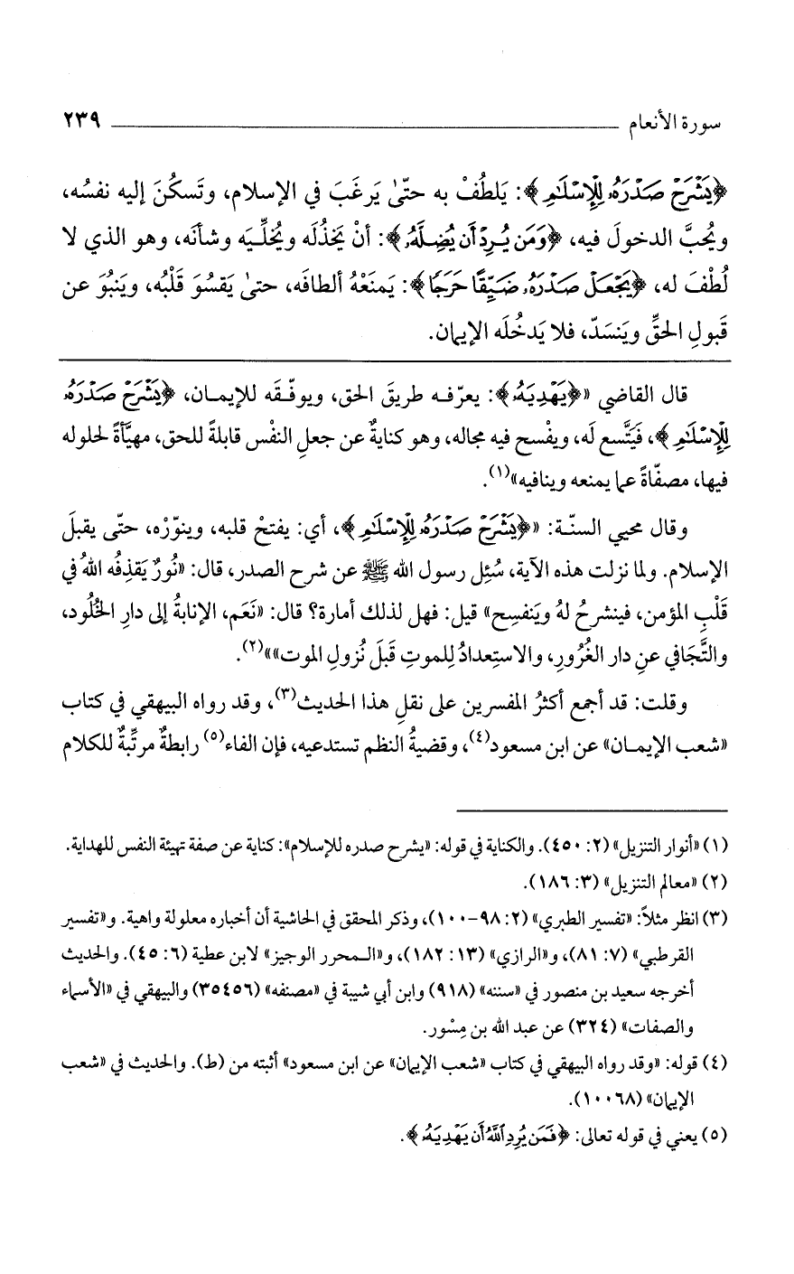 وقال محيي السنة: " (يشرح صدره للإسلام)، أي: يفتح قلبه، وينوره، حتى يقبل الإسلام. ولما نزلت هذه الآية، سئل رسول الله صلي الله عليه وسلم عن شرح الصدر، قال: "نور يقذفه الله في قلب المؤمن، فينشرح له وينفسح" قيل: فهل لذلك أمارة؟ قال: "نعم، الإنابة إلى دار الخلود، والتجافي عن دار الغرور، والاستعداد للموت قبل نزول الموت"".