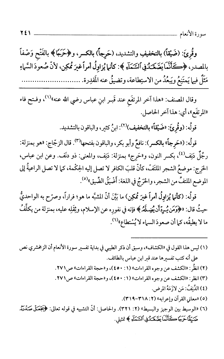 قوله: ("حرجاً" بالكسر): نافع وأبو بكر، والباقون بفتحها. قال الزجاج: "هو بمنزلة: رجل دنف، بكسر النون، و"حرج" بمنزلة: دنف، والمعنى: ذو دنف. وعن ابن عباس، الحرج: موضع الشجر الملتف، كأن قلب الكافر لا تصل إليه الحكمة، كما لا تصل الراعية إلى الموضع الملتف من الشجر، والحرج في اللغة: أضيق الضيق".