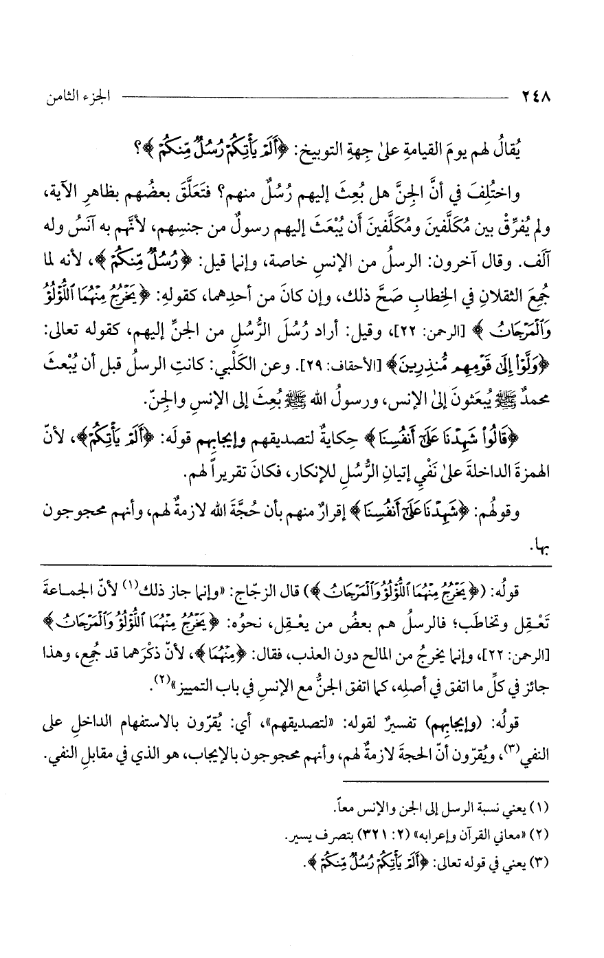 قوله: ((يَخْرُجُ مِنْهُمَا اللُّؤْلُؤُ والْمَرْجَانُ)) قال الزجاج: "وإنما جاز ذلك لأن الجماعة تعقل وتخاطب؛ فالرسل هم بعض من يعقل، نحوه: (يَخْرُجُ مِنْهُمَا اللُّؤْلُؤُ والْمَرْجَانُ) [الرحمن: 22]، وإنما يخرج من المالح دون العذب، فقال: (منهما)، لأن ذكرهما قد جمع، وهذا جائز في كل ما اتفق في أصله، كما اتفق الجن مع الإنس في باب التمييز".