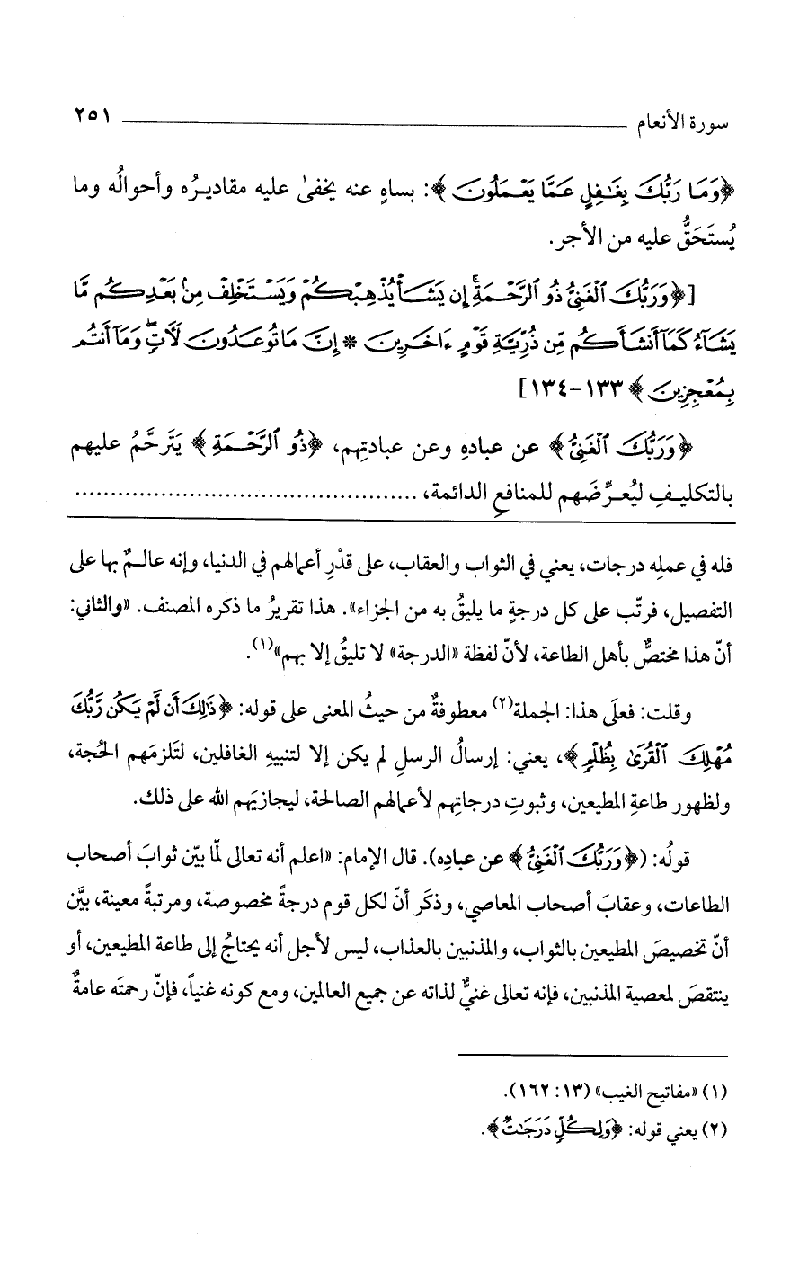 قوله: ((وربك الغني) عن عباده). قال الإمام: "اعلم أنه تعالى لما بين ثواب أصحاب الطاعات، وعقاب أصحاب المعاصي، وذكر أن لكل قوم درجةً مخصوصة، ومرتبةً معينة، بين أن تخصيص المطيعين بالثواب، والمذنبين بالعذاب، ليس لأجل أنه يحتاج إلى طاعة المطيعين، أو ينتقص لمعصية المذنبين، فإنه تعالى غني لذاته عن جميع العالمين، ومع كونه غنياً، فإن رحمته عامة