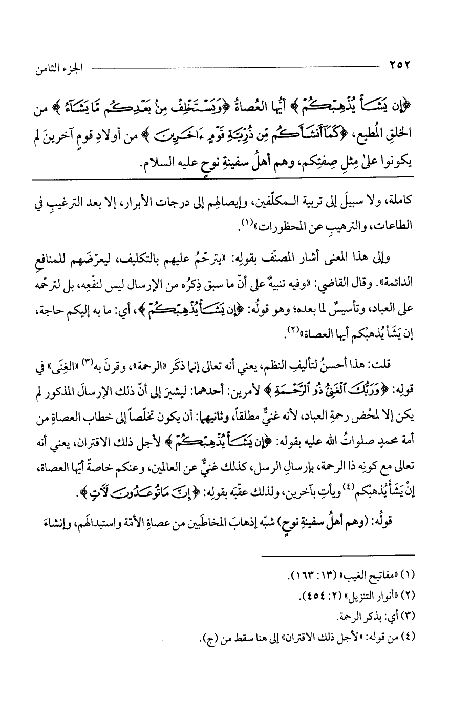 وإلى هذا المعنى أشار المصنف بقوله: "يترحم عليهم بالتكليف، ليعرضهم للمنافع الدائمة". وقال القاضي: "وفيه تنبيه على أن ما سبق ذكره من الإرسال ليس لنفعه، بل لترحمه على العباد، وتأسيس لما بعده؛ وهو قوله: (إن يَشَا يُذْهِبْكُمْ)، أي: ما به إليكم حاجة. إن يشأ يذهبكم أيها العصاة".