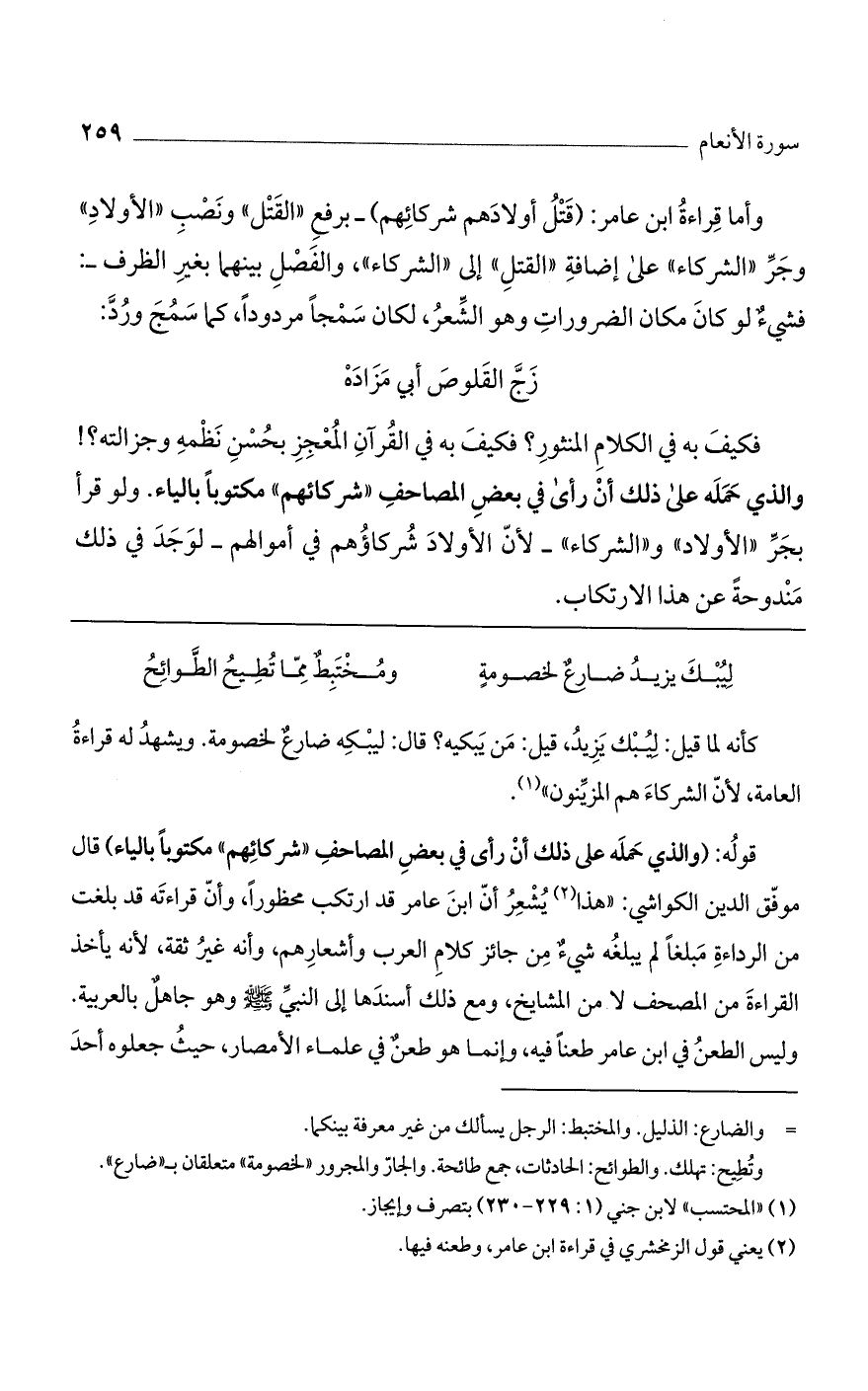 فكيف به في الكلام المنثور؟ فكيف به في القرآن المعجز بحسن نظمه وجزالته؟ ! والذي حمله على ذلك أن رأى في بعض المصاحف شركاؤهم مكتوباً بالياء. ولو قرأ بجر "الأولاد" و"الشركاء" - لأن الأولاد شركاؤهم في أموالهم - لوجد في ذلك مندوحة عن هذا الارتكاب.
