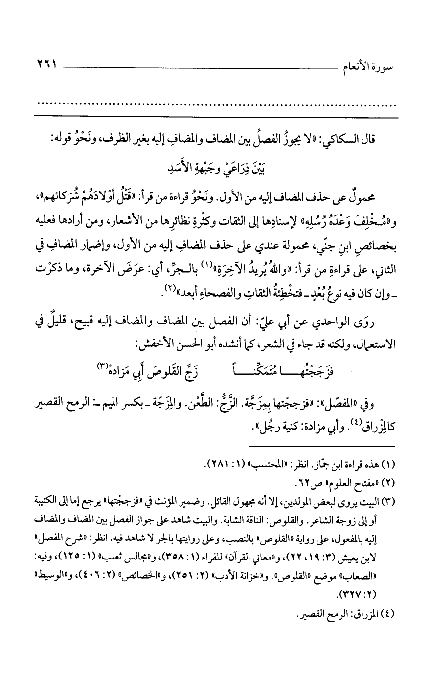 روى الواحدي عن أبي علي: أن الفصل بين المضاف والمضاف إليه قبيح، قليل في الاستعمال، ولكنه قد جاء في الشعر، كما أنشده أبو الحسن الأخفش: