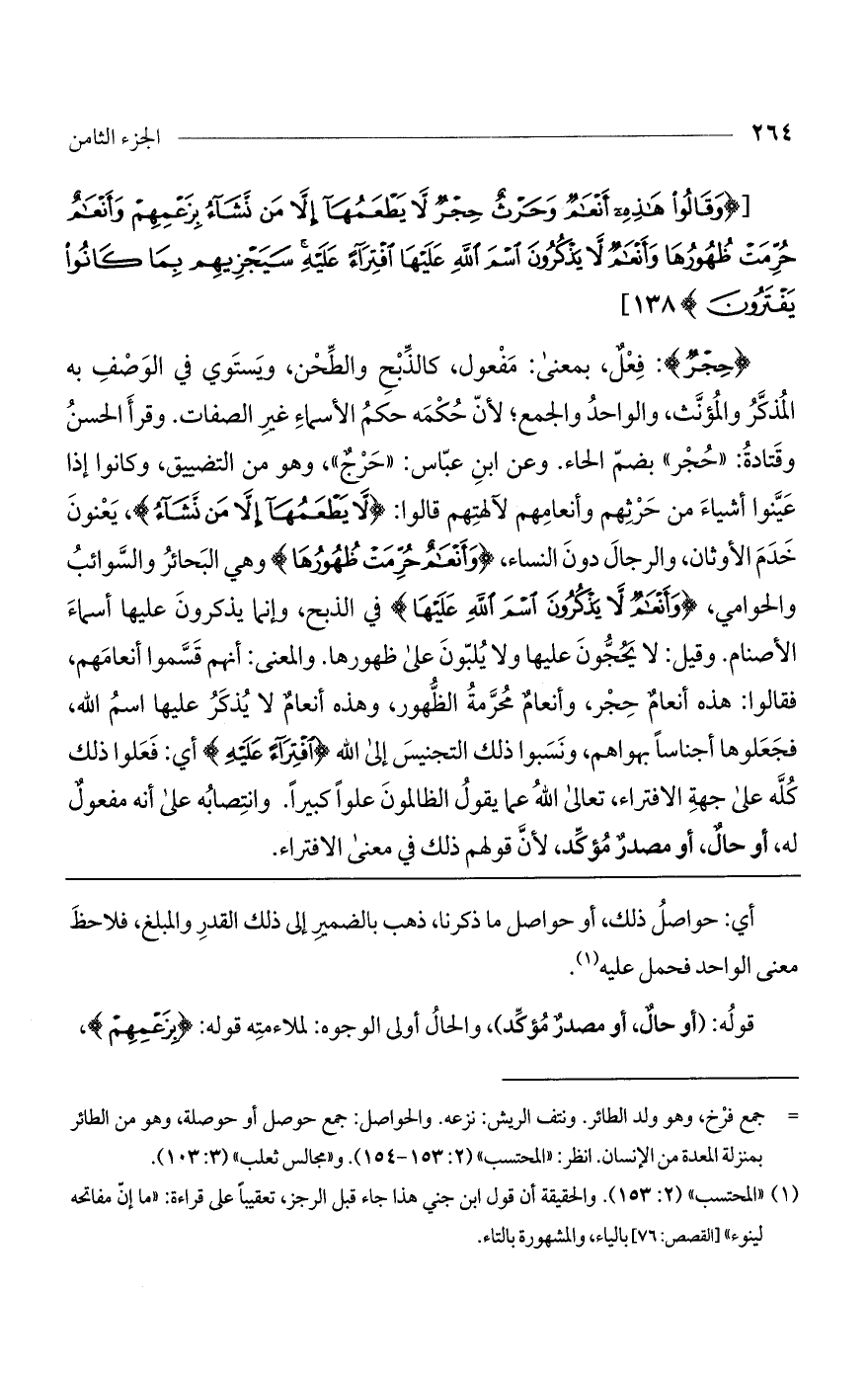 (حِجْرٌ): فعلٌ، بمعنى: مفعول، كالذبح والطحن، ويستوي في الوصف به المذكر والمؤنث والواحد والجمع، لأن حكمه حكم الأسماء غير الصفات. وقرأ الحسن وقتادة «حُجر» بضم الحاء. وعن ابن عباس: "حرجٌ"، وهو من التضييق وكانوا إذا عينوا أشياء من حرثهم وأنعامهم لآلهتهم قالوا: (لا يَطْعَمُها إِلَّا مَنْ نَشاءُ)، يعنون خدم الأوثان، والرجال دون النساء، (وَأَنْعامٌ حُرِّمَتْ ظُهُورُها) وهي البحائر والسوائب والحوامي (وَأَنْعامٌ لا يَذْكُرُونَ اسْمَ اللَّهِ عَلَيْهَا) في الذبح، وإنما يذكرون عليها أسماء الأصنام. وقيل: لا يحجون عليها ولا يلبون على ظهورها. والمعنى: