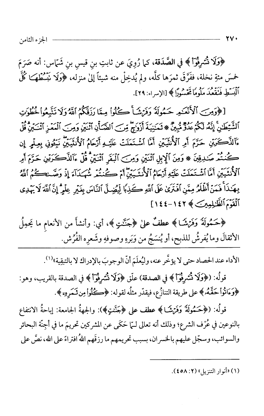 قوله: ((ولا تسرفوا) في الصدقة) علق (ولا تسرفوا) في الصدقة بالقريب، وهو: (وءاتوا حقه) على طريقة التنازع، فيقدر مثله لقوله: (كلوا من ثمره).