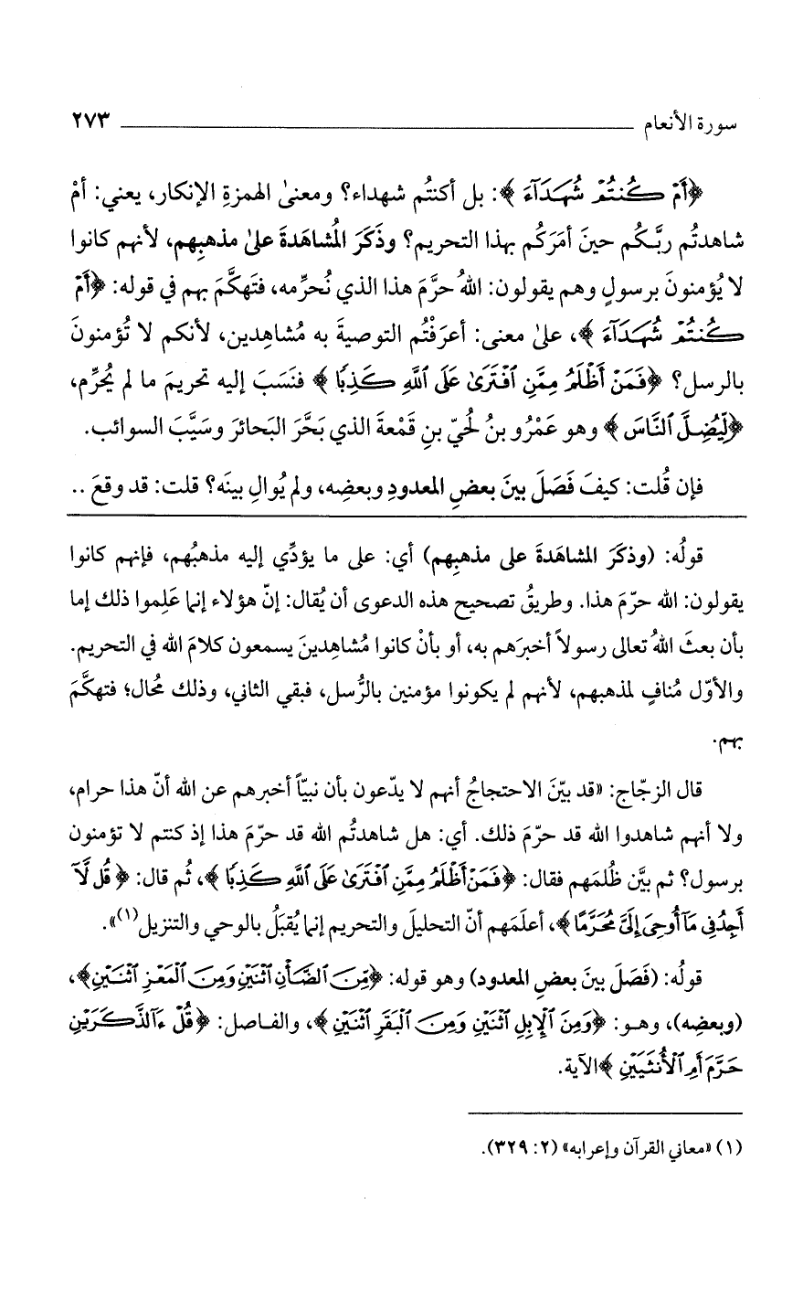 قال الزجاج: "قد بين الاحتجاج أنهم لا يدعون بأن نبياً أخبرهم عن الله أن هذا حرام، ولا أنهم شاهدوا الله قد حرم ذلك. أي: هل شاهدتم الله قد حرم هذا إذ كنتم لا تؤمنون برسول؟ ثم بين ظلمهم فقال: (فَمَنْ أَظْلَمُ مِمَّنِ افْتَرَى عَلَى اللَّهِ كَذِبًا)، ثم قال: (قُل لاَّ أَجِدُ فِي مَا أُوحِيَ إلَيَّ مُحَرَّمًا)، أعلمهم أن التحليل والتحريم إنما يقبل بالوحي والتنزيل".