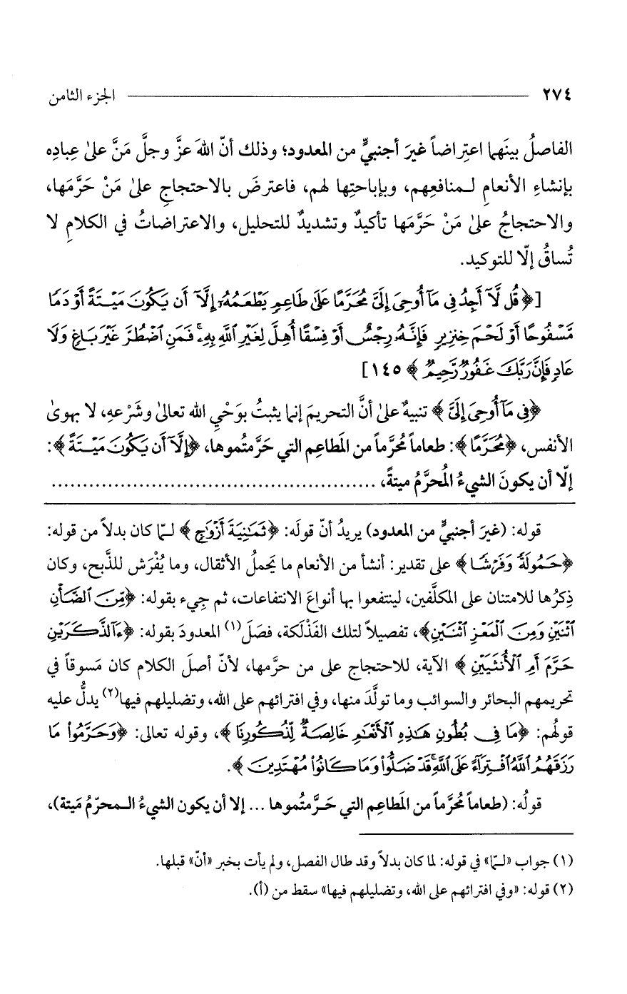 (فِي ما أُوحِيَ إِلَيَّ) تنبيهٌ على أنّ التحريم إنما يثبت بوحي الله تعالى وشرعه، لا بهوى الأنفس، (مُحَرَّماً): طعاماً محرّماً من المطاعم التي حرّمتموها، (إِلَّا أَنْ يَكُونَ مَيْتَةً) إلا أن يكون الشيء المحرّم ميتة،
