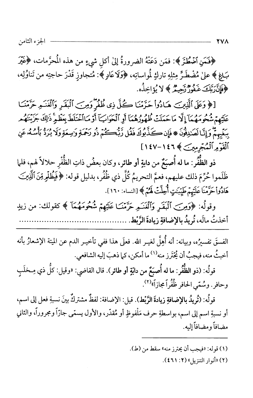 قوله: (ذو الظفر: ما له أصبع من دابةٍ أو طائر). قال القاضي: "وقيل: كل ذي مخلبٍ وحافر. وسمي الحافر ظفراً مجازاً".