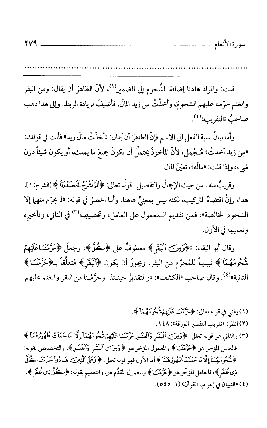 وقال أبو البقاء: " (ومن البقر) معطوف على (كل)، وجعل (حرمنا عليهم شحومهما) تبييناً للمحرم من البقر. ويجوز أن يكون (البقر) متعلقاً بـ (حرمنا) الثانية". وقال صاحب "الكشف": "والتقدير حينئذ: وحرمنا من البقر والغنم عليهم