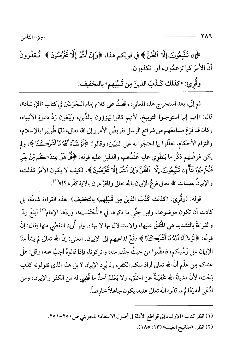 ثم إني، بعد استخراج هذه المعاني، وقفت على كلام إمام الحرمين في كتاب "الإرشاد"، قال: "إنهم إنما استوجبوا التوبيخ، لأنهم كانوا يهزؤون بالدين، ويبغون رد دعوة الأنبياء، وكان قد قرع مسامعهم من شرائع الرسل تفويض الأمور إلى الله تعالى، فلما طولبوا بالإسلام، والتزام الأحكام، تعللوا بما احتجوا به على النبيين، وقالوا: (لَوْ شَاءَ اللَّهُ مَا أَشْرَكْنَا)، ولم يكن غرضهم ذكر ما ينطوي عليه عقدهم، والدليل عليه قوله: (قُلْ هَلْ عِندَكُم مِّنْ عِلْمٍ فَتُخْرِجُوهُ لَنَا إن تَتَّبِعُونَ إلاَّ الظَّنَّ وإنْ أَنتُمْ إلاَّ تَخْرُصُونَ)، فكيف لا يكون الأمر كذلك، والإيمان بصفات الله تعالى فرع الإيمان بالله تعالى والمقرعون بالآية كفرة؟ ! ".