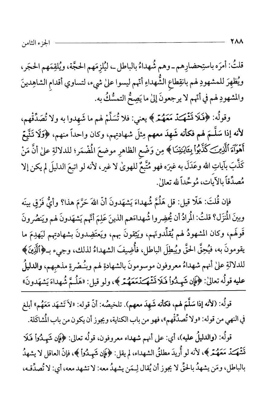 قلت: أمره باستحضارهم- وهم شهداء بالباطل-، ليلزمهم الحجة، ويلقمهم الحجر، ويظهر للمشهود لهم بانقطاع الشهداء أنهم ليسوا على شيء، لتساوي أقدام الشاهدين والمشهود لهم في أنهم لا يرجعون إلى ما يصح التمسك به.