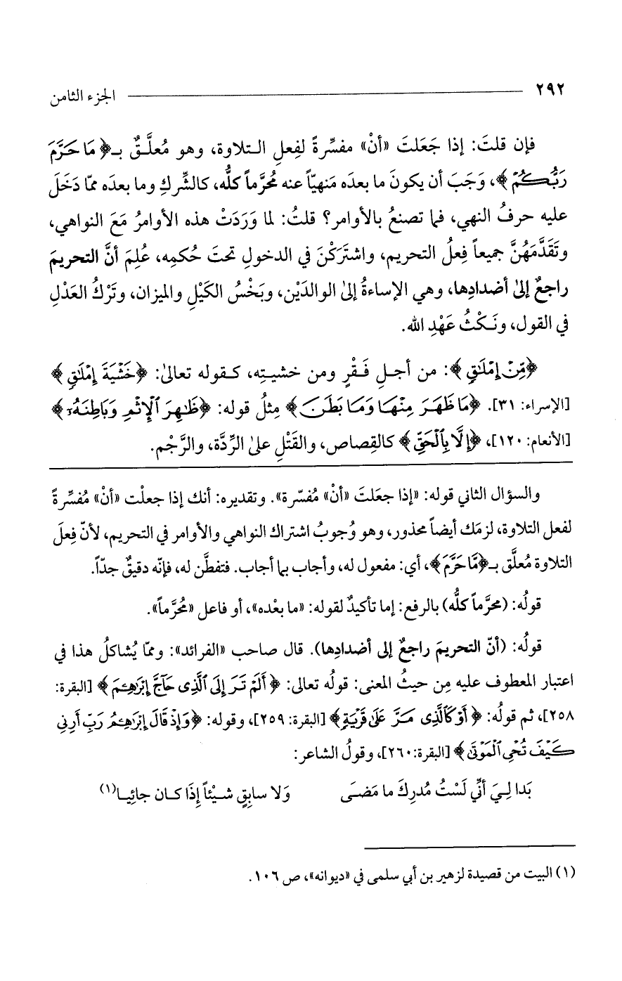 والسؤال الثاني قوله: "إذا جعلت "أن" مفسرة". وتقديره: أنك إذا جعلت "أن" مفسرةً لفعل التلاوة، لزمك أيضاً محذور، وهو وجوب اشتراك النواهي والأوامر في التحريم، لأن فعل التلاوة معلق بـ (ما حرم)، أي: مفعول له، وأجاب بما أجاب. فتفطن له، فإنه دقيق جداً.