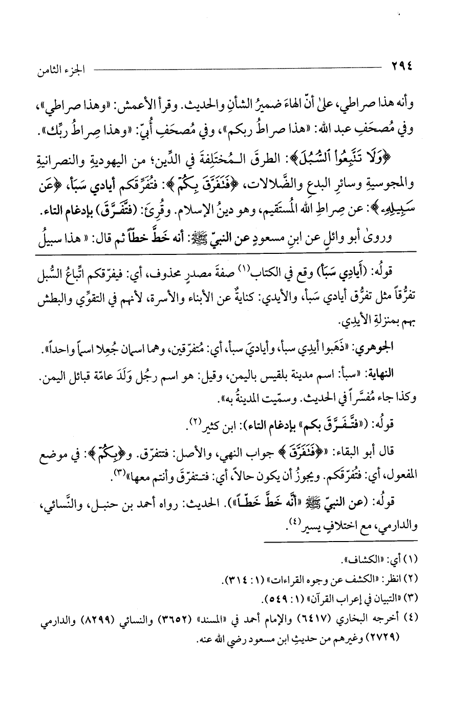 قوله: (أيادي سبأ) وقع في الكتاب صفة مصدرٍ محذوف، أي: فيفرقكم إتباع السبل تفرقاً مثل تفرق أيادي سبأ، والأيدي: كناية عن الأبناء والأسرة، لأنهم في التقوى والبطش بهم بمنزلة الأيدي.