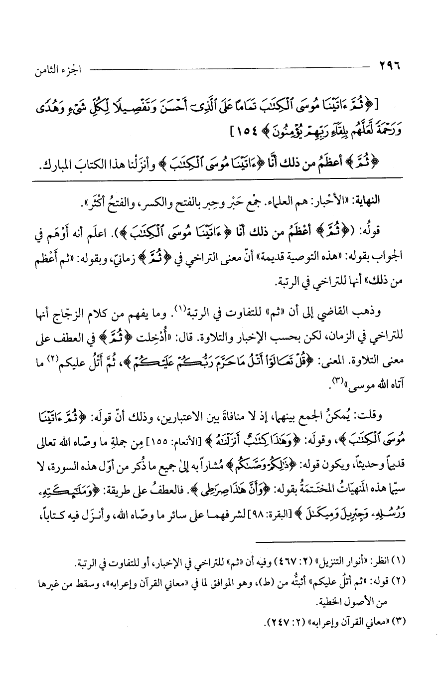 وذهب القاضي إلى أن "ثم" للتفاوت في الرتبة. وما يفهم من كلام الزجاج أنها للتراخي في الزمان، لكن بحسب الإخبار والتلاوة. قال: "أدخلت (ثم) في العطف على معنى التلاوة. المعنى: (قُلْ تَعَالَوْا أَتْلُ مَا حَرَّمَ رَبُّكُمْ عَلَيْكُمْ)، ثم أتل عليكم ما آتاه الله موسي".